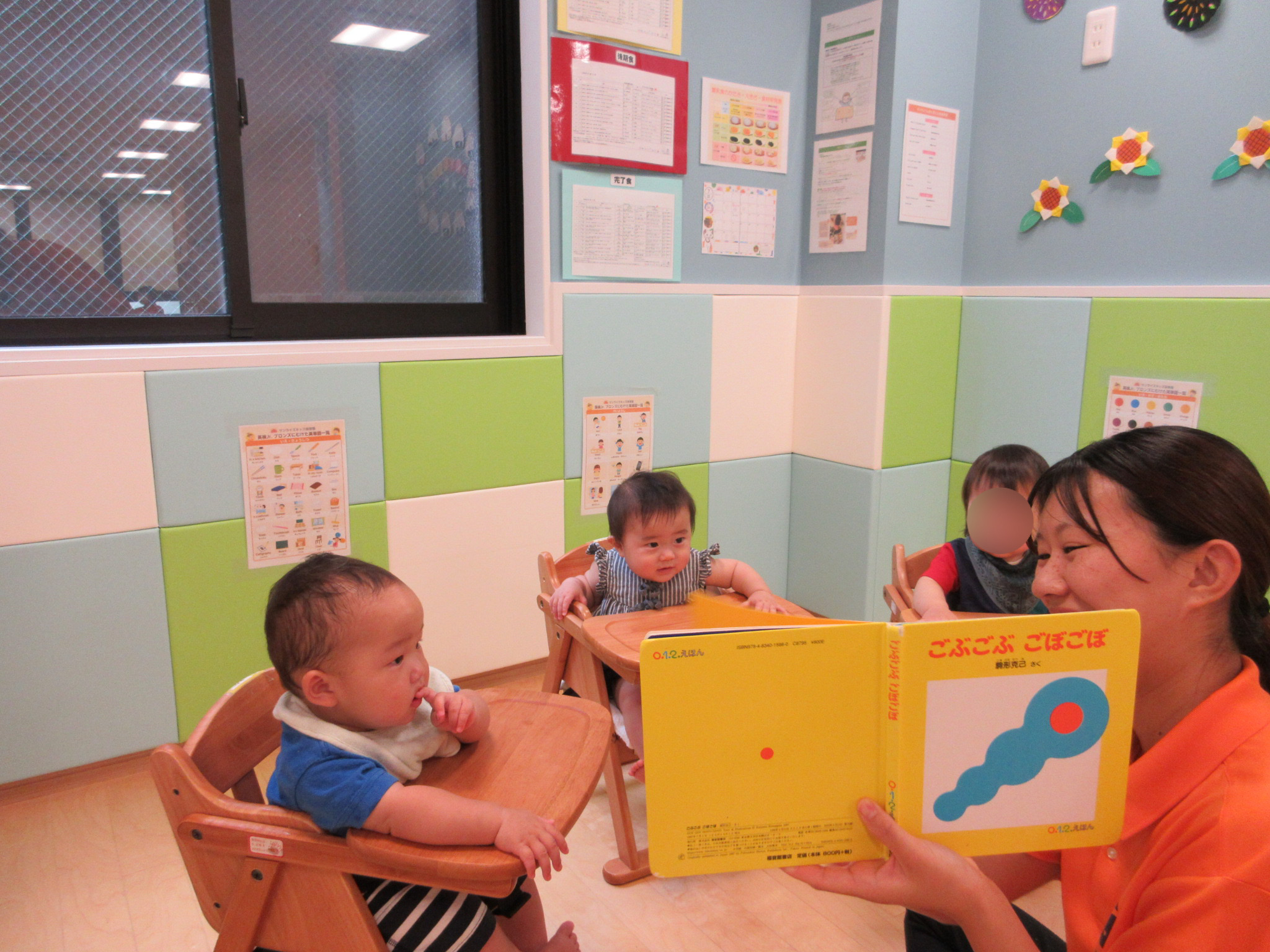先生が読んでいると、子どもたちは擬音が面白いようでニコニコと笑って楽しそうに聞いています![]()