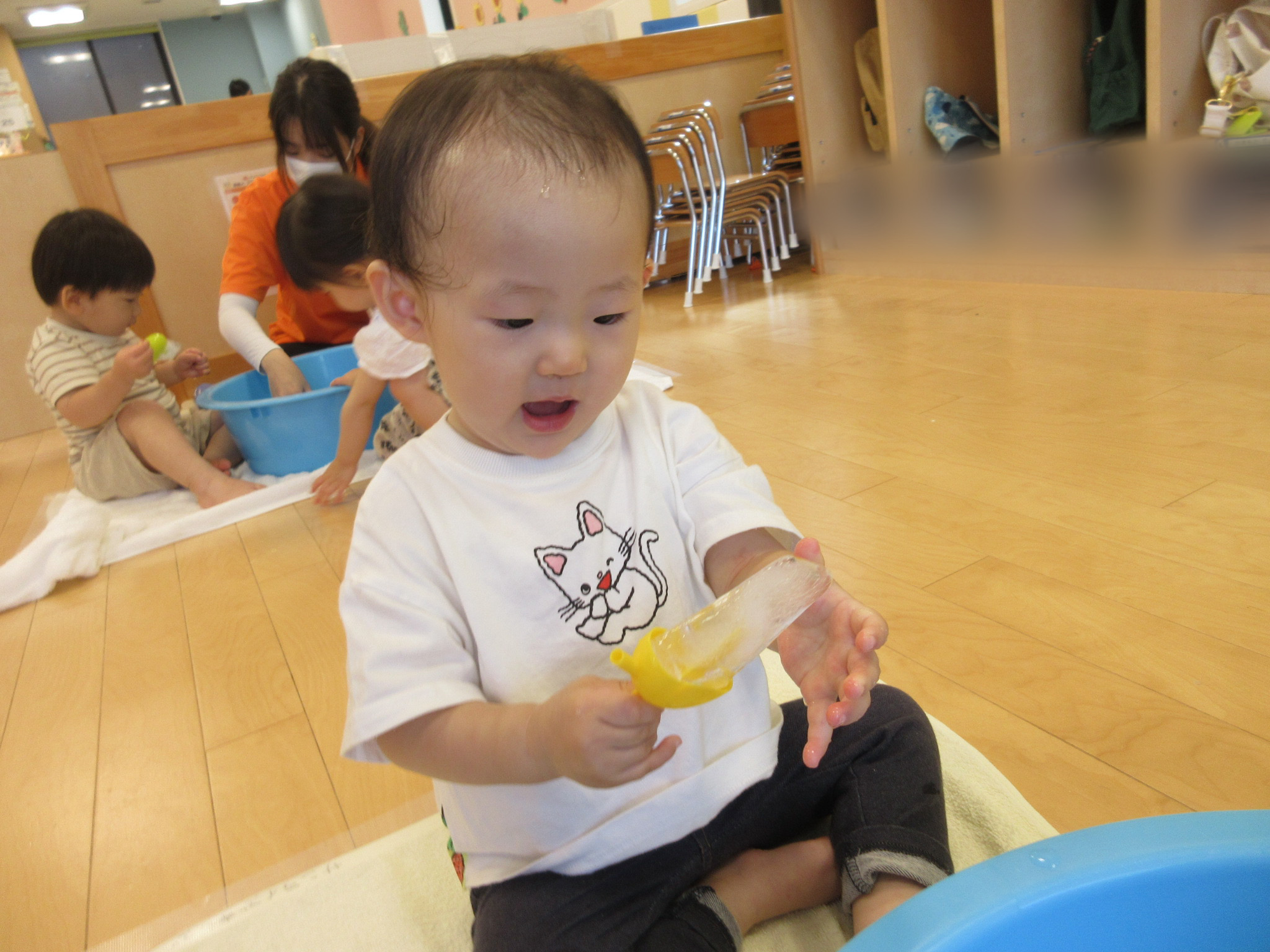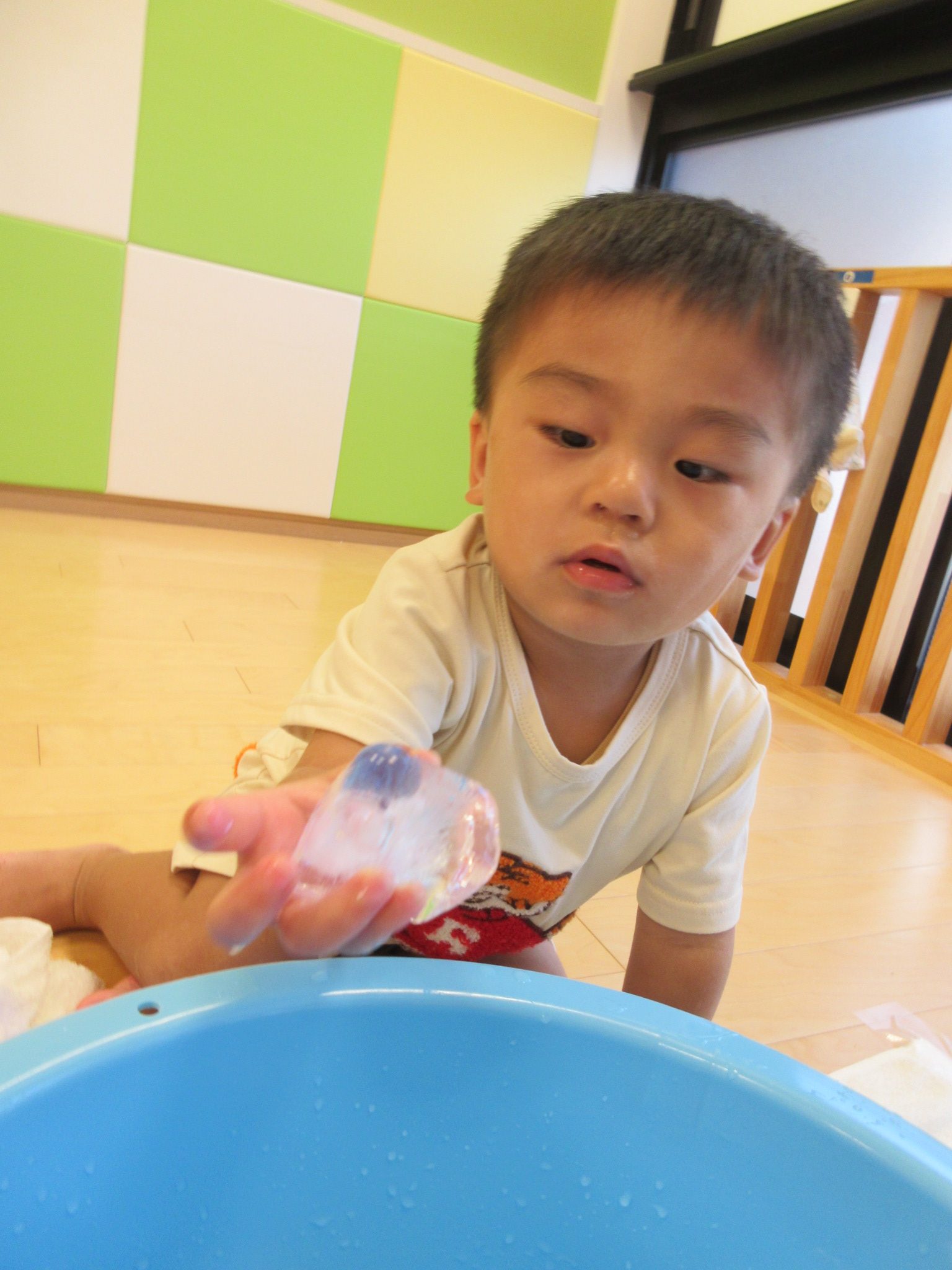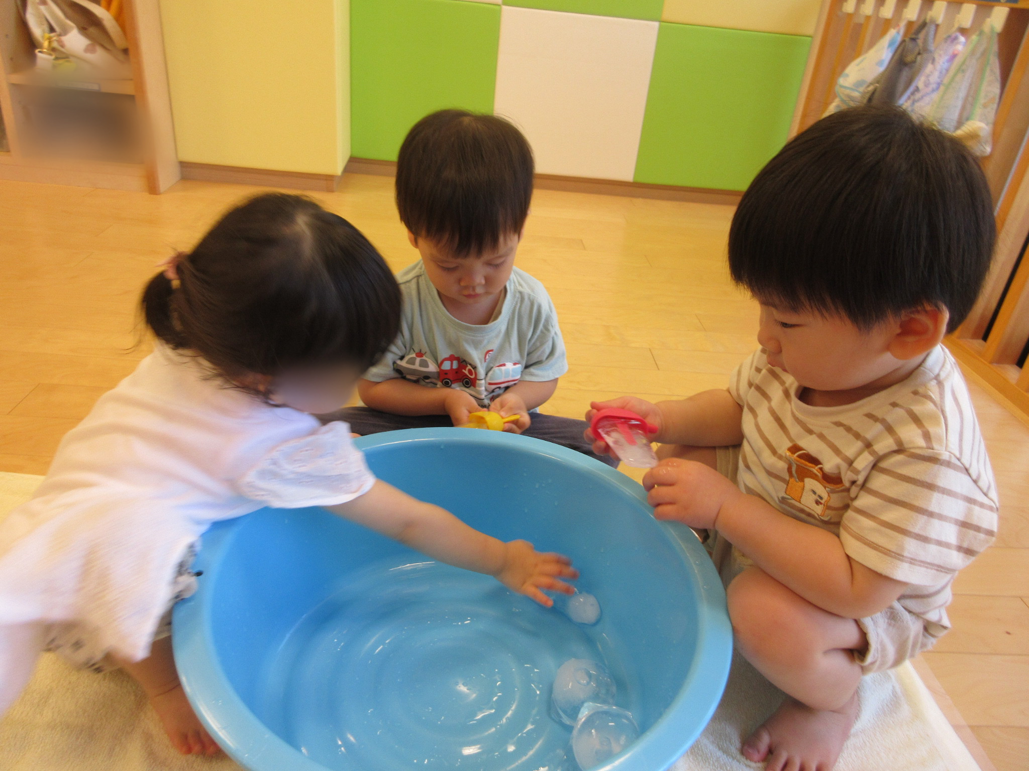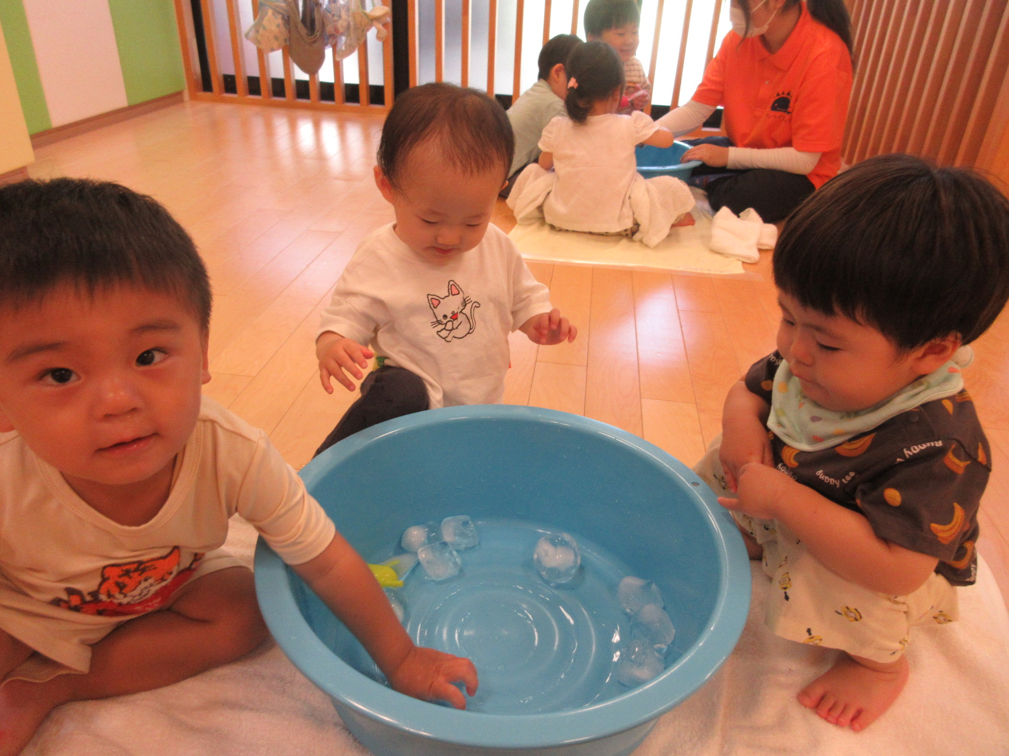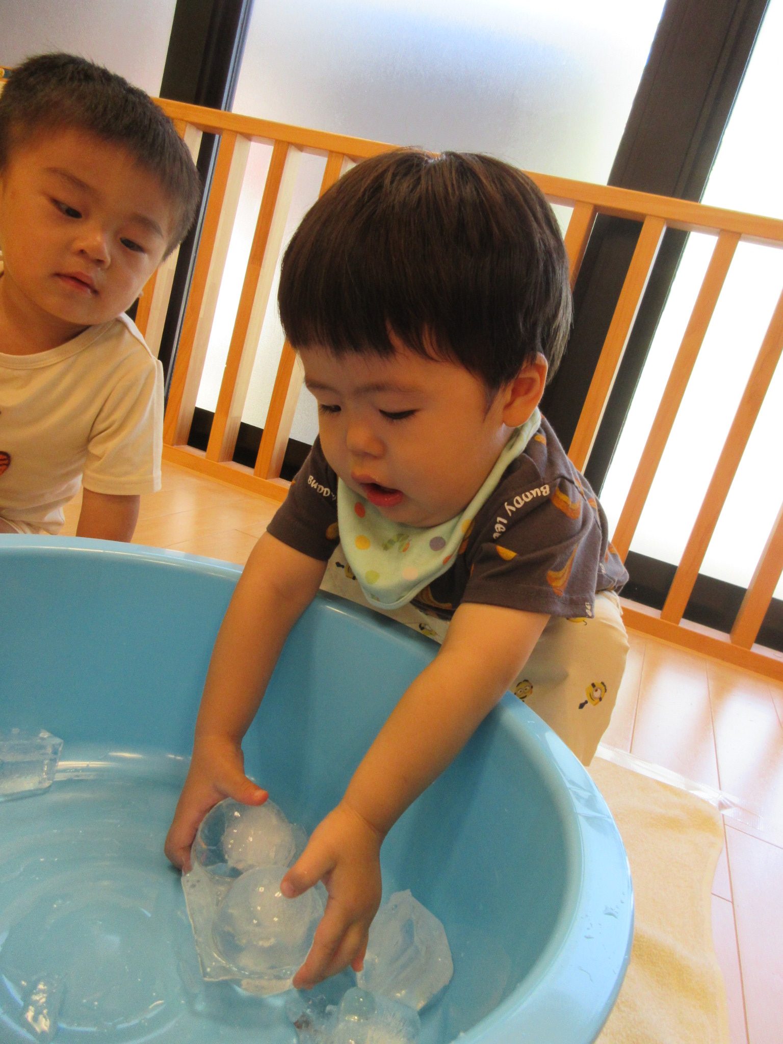 タライをお部屋に準備するとキョロキョロしながらなにが始まるんだろう?と興味津々だった子どもたち。タライに様々な形の氷を入れると大はしゃぎで触っていました![]()