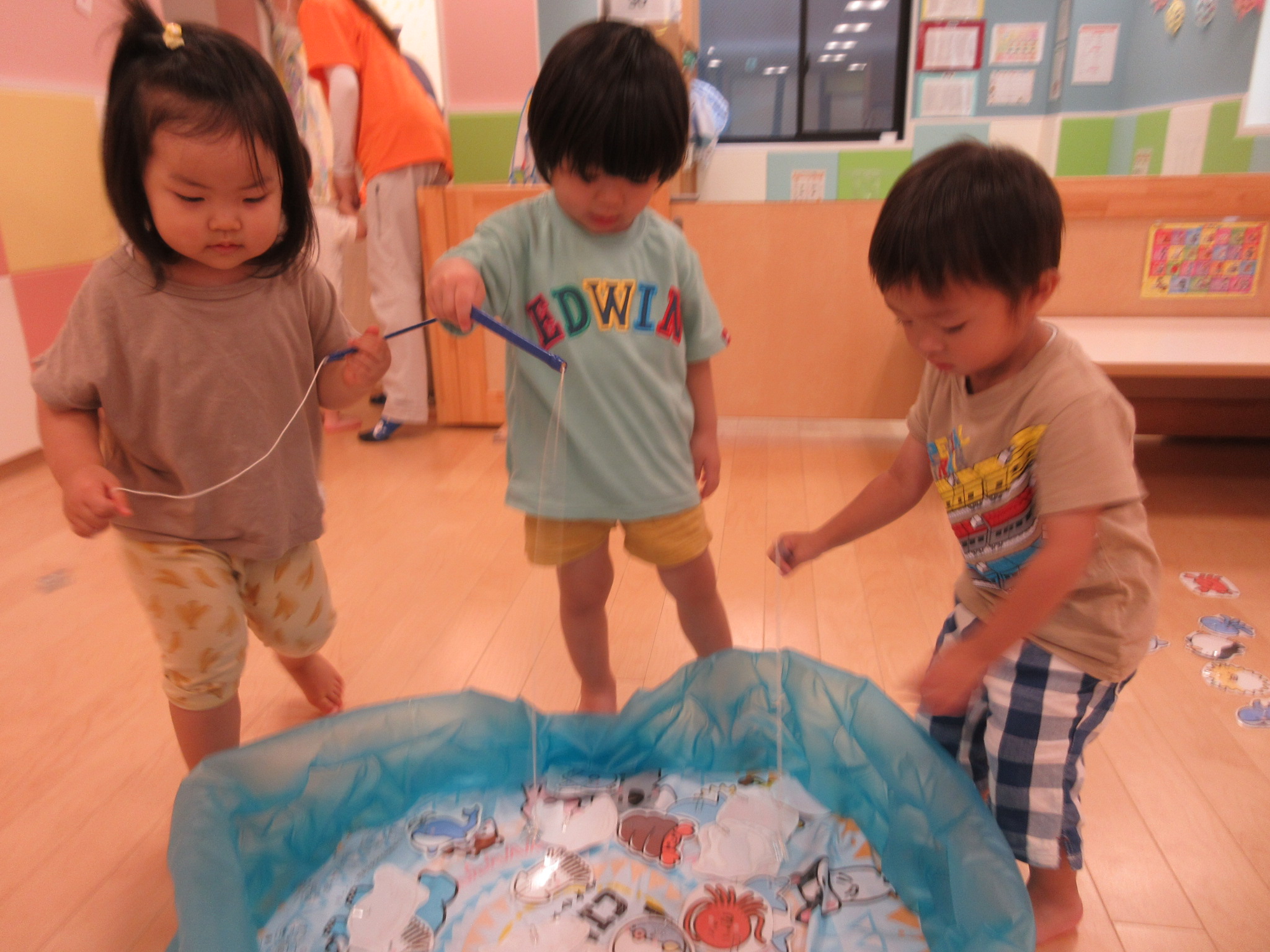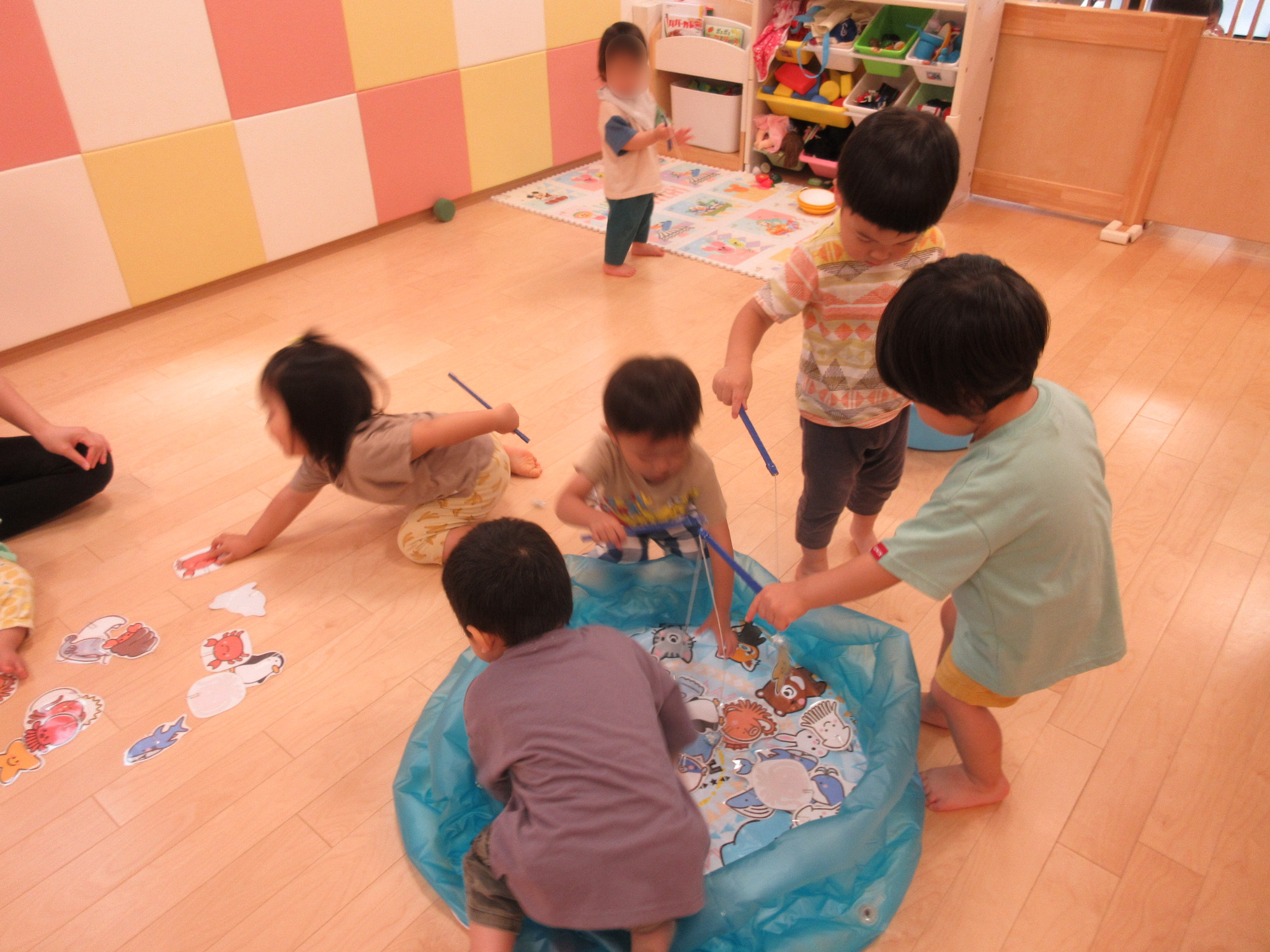 ビニールプールの中にいる魚やタコ、サメなどの海の生き物つりを楽しむ子どもたち![]()