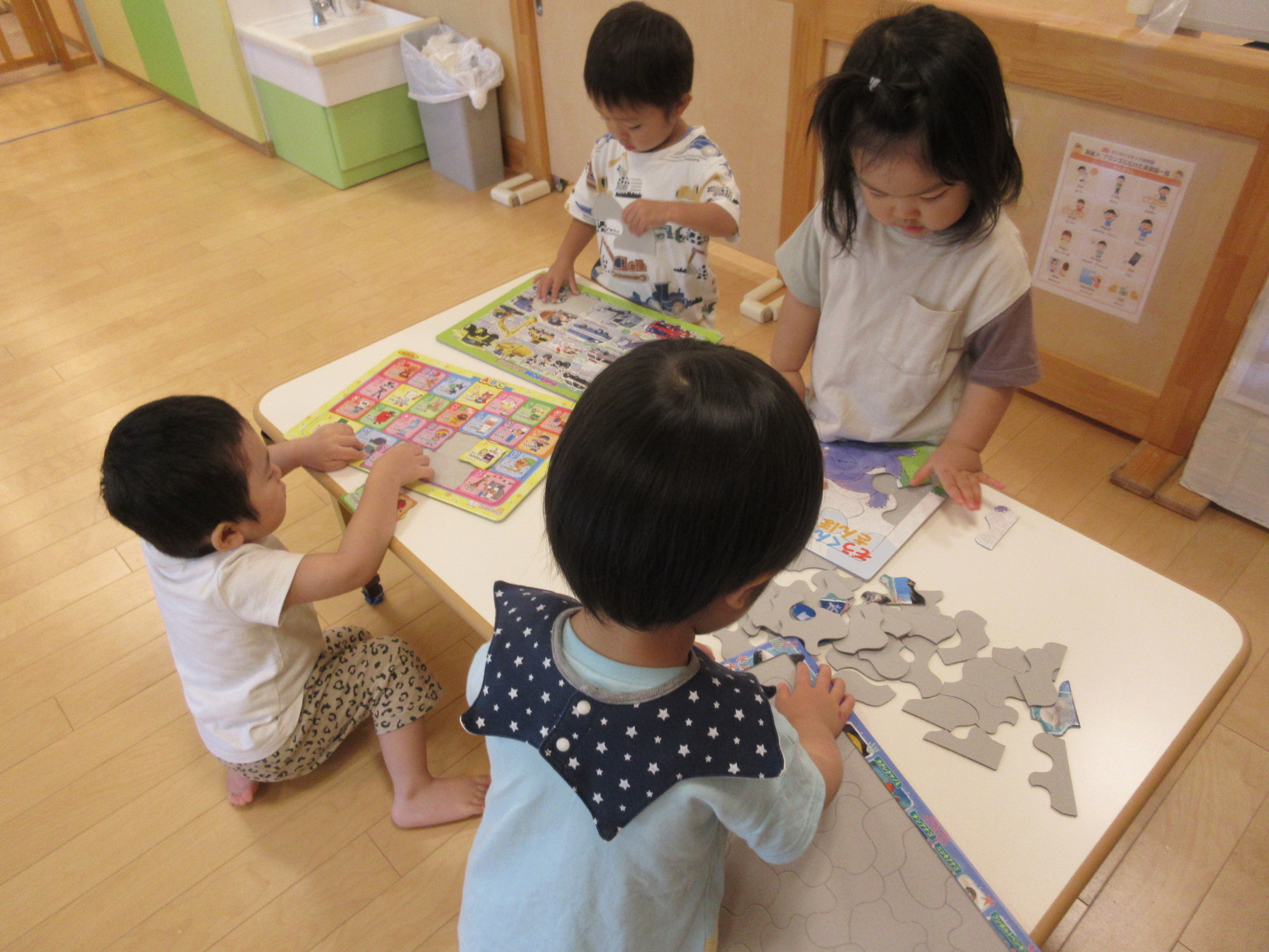 みんなで机を囲んでパズルをする姿も可愛らしいりんご組さんです![]()