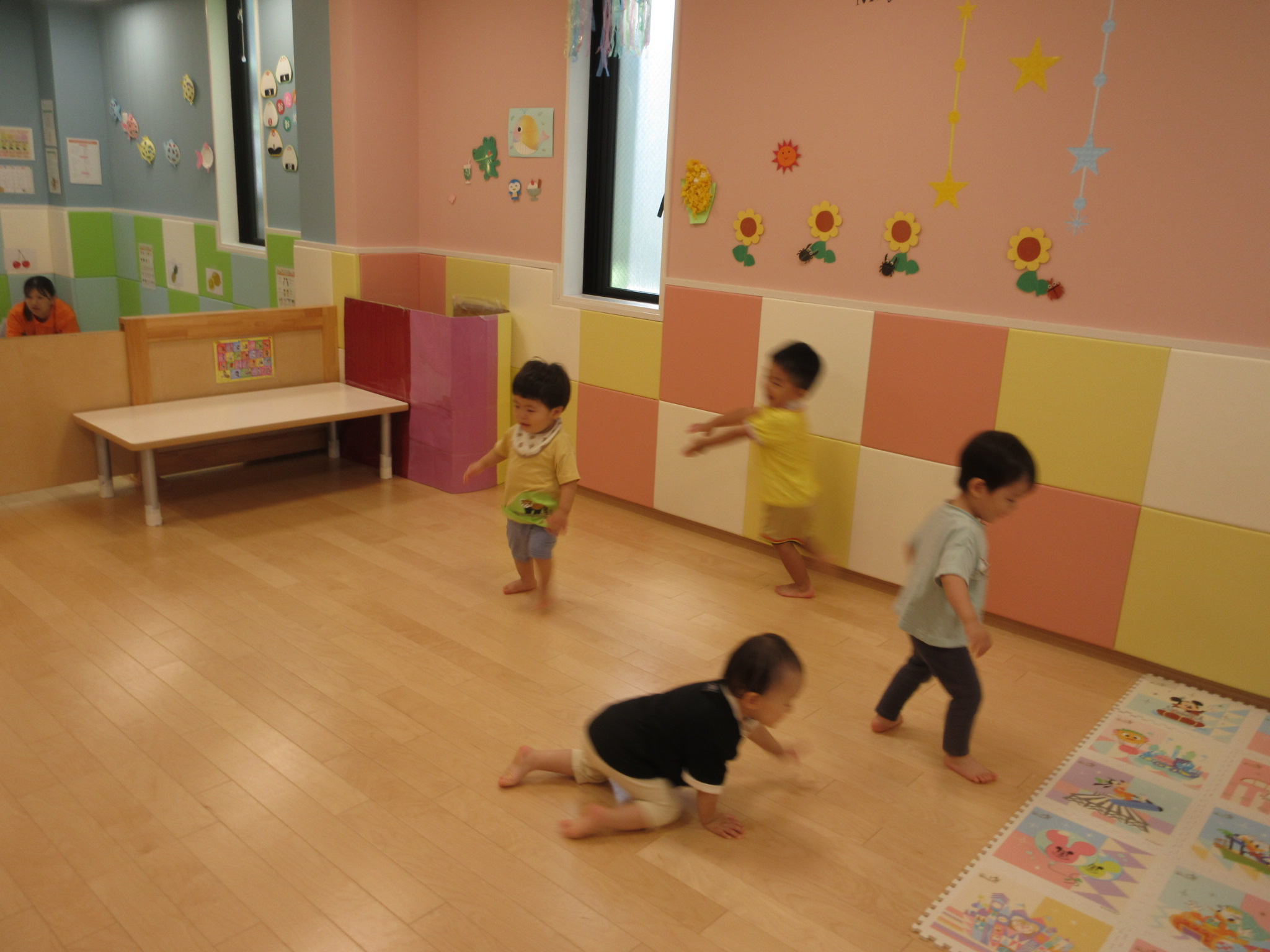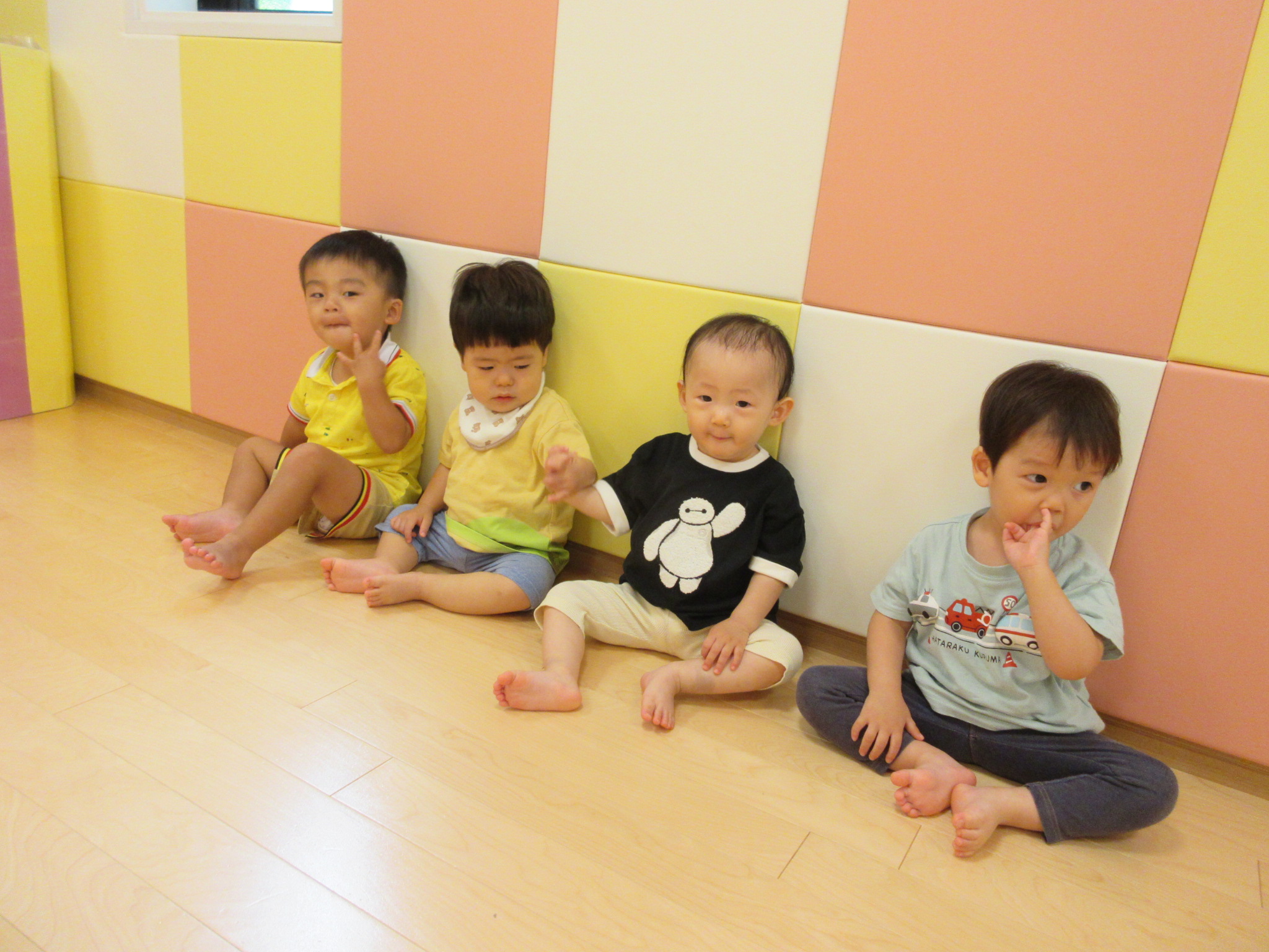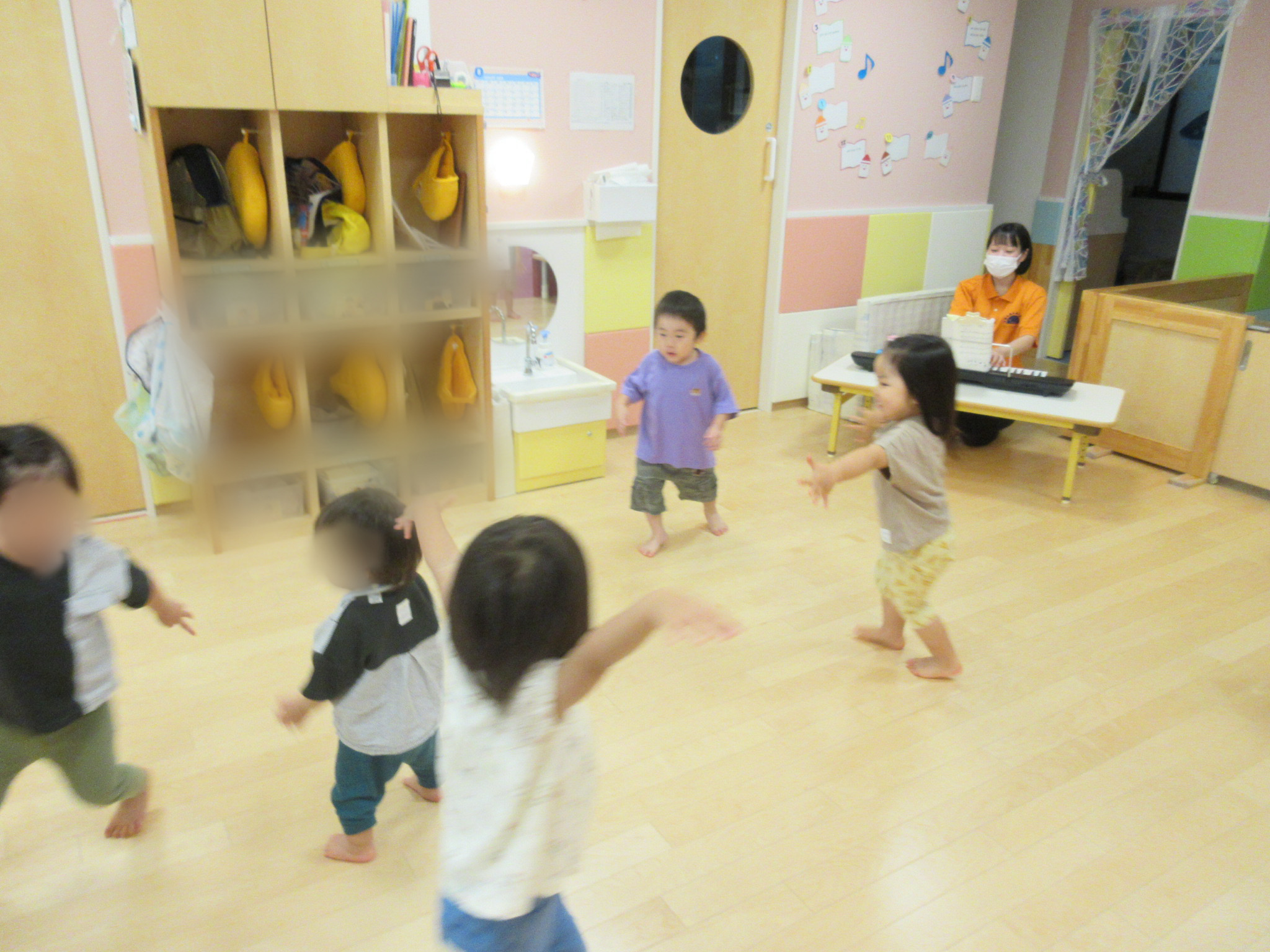 むすんでひらいての音楽に合わせてノリノリでお部屋の中を歩いたり、先生がむーすーんでひらいて、手をうってむーすんで、またひたいて手をうってその手を「横に」というと飛行機になって走ったりしていました![]()