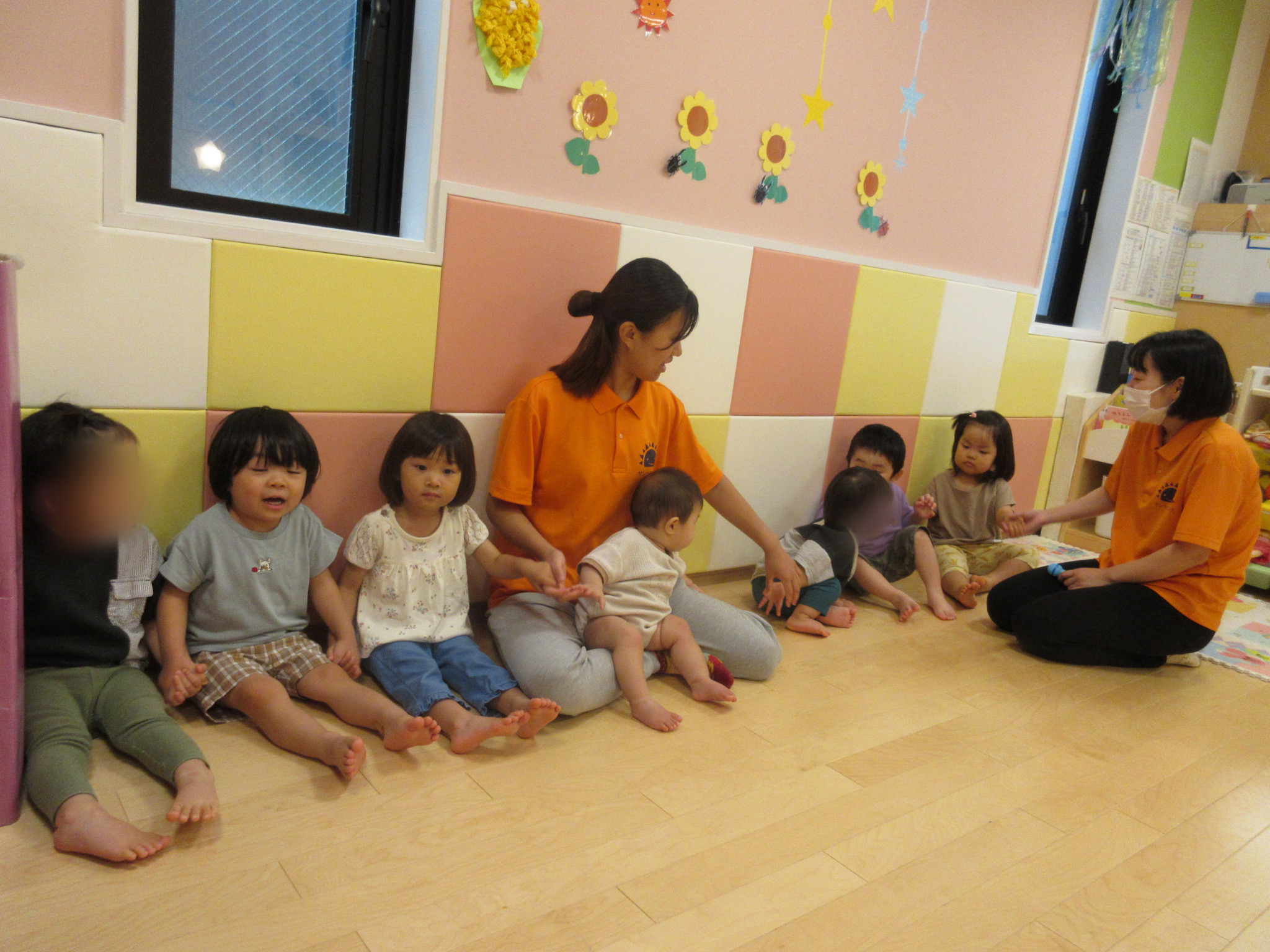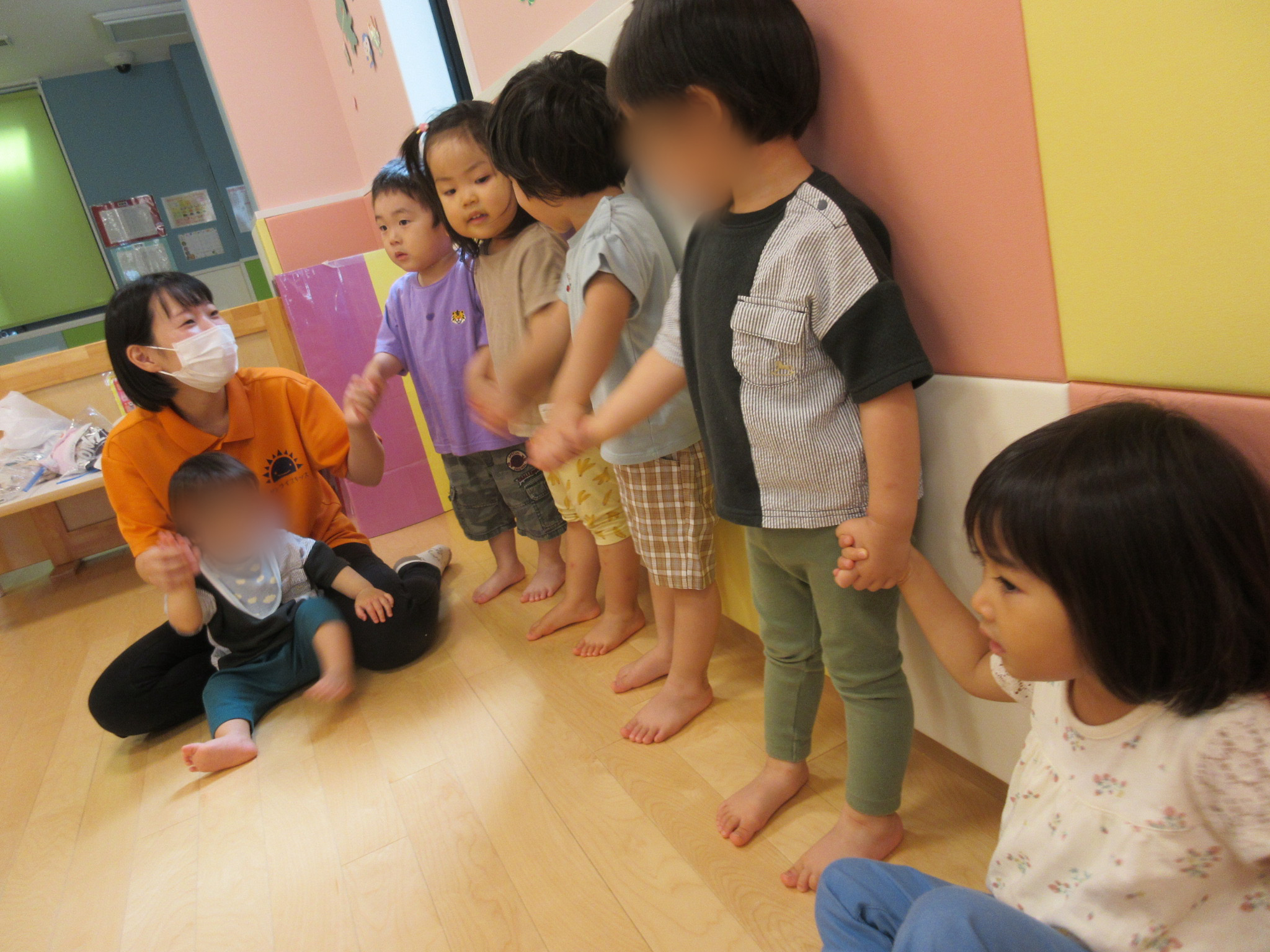 リトミックの最初と最後にはみんなで手を繋いで「ぎゅっぎゅっぎゅーと手を繋ごう」と始まりの歌と終わりの歌を歌います![]()