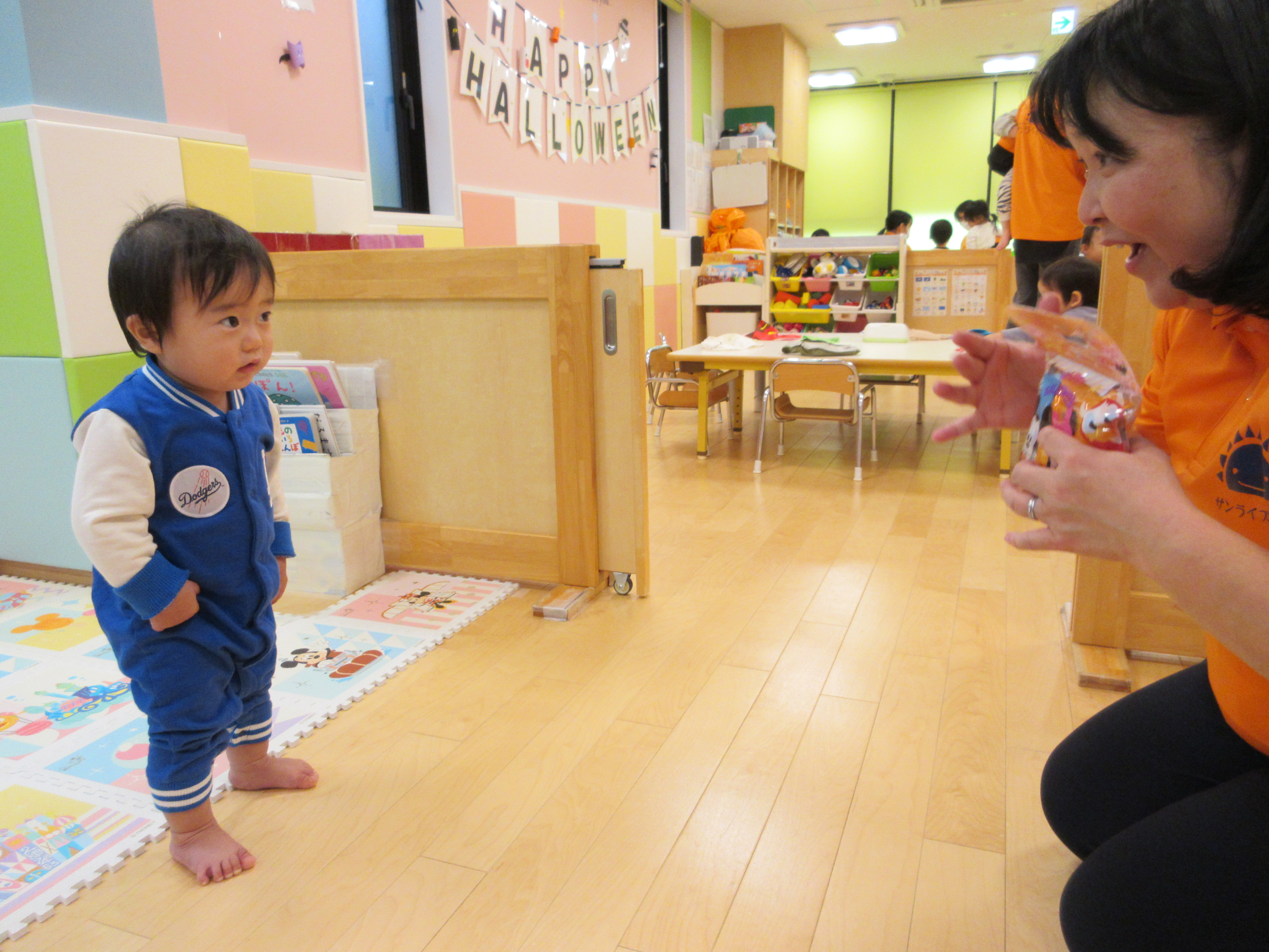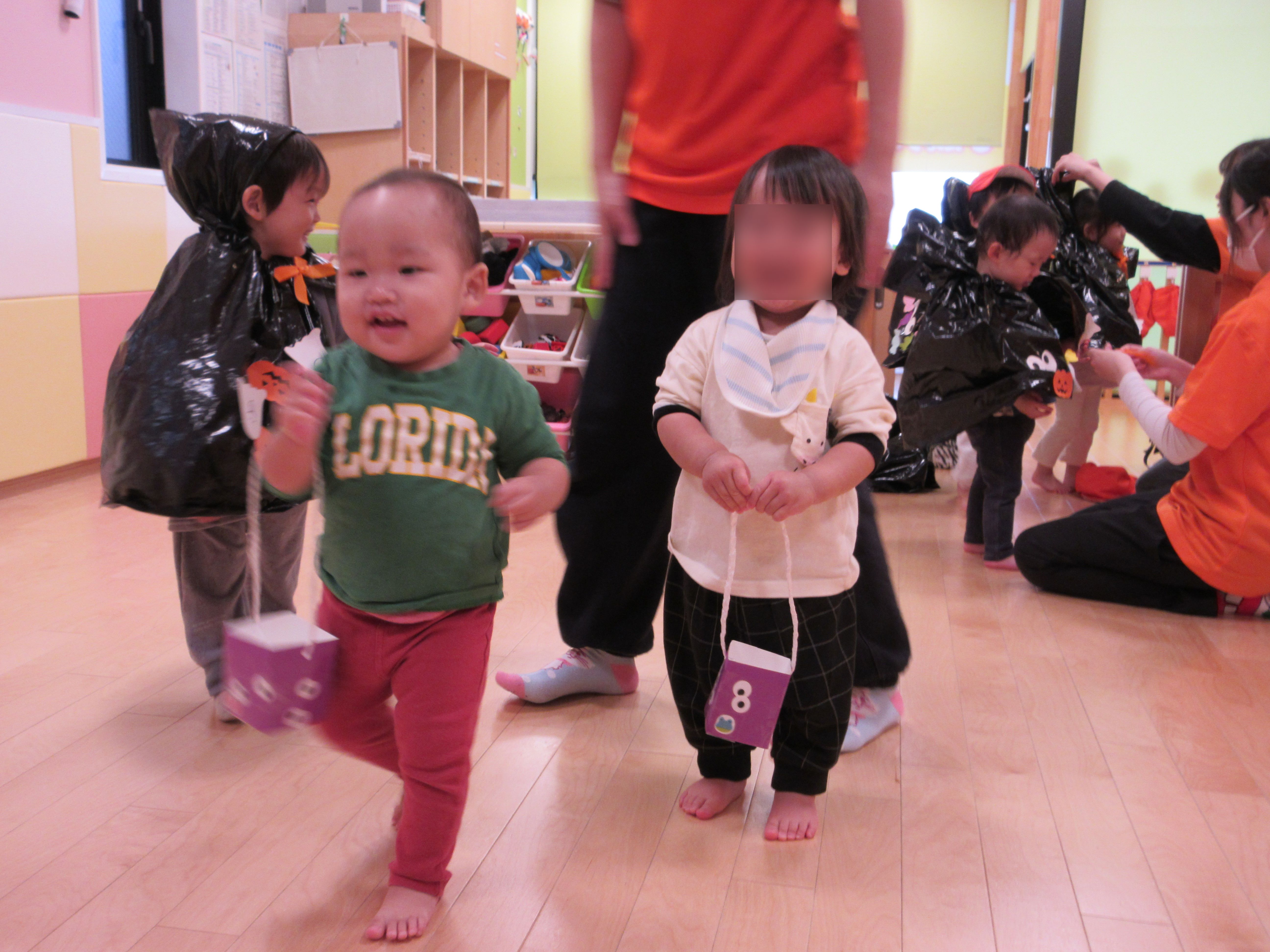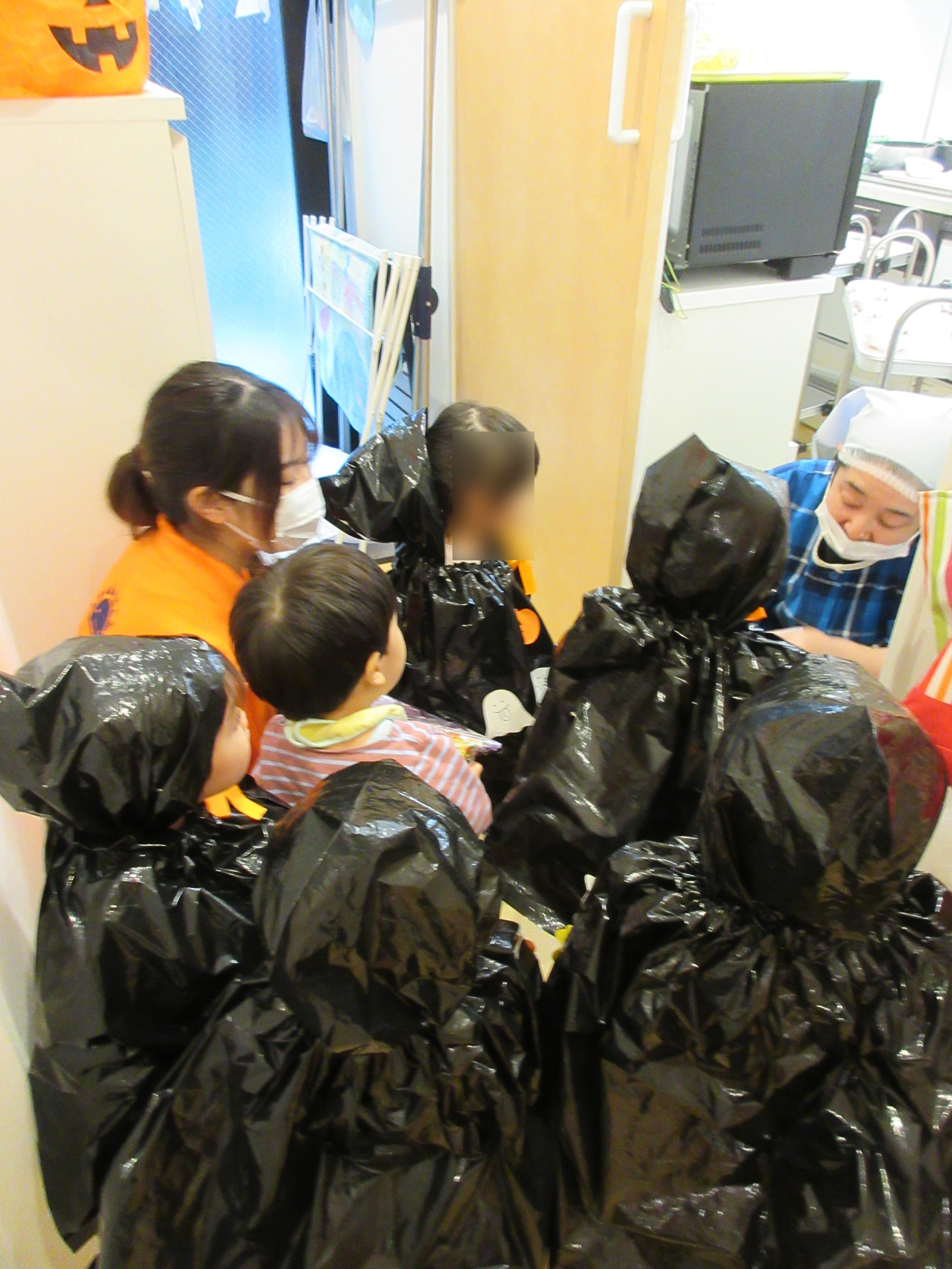 保育園に戻りいよいよ本番という様子、園長先生そして給食の先生のところに、可愛いイタズラするかのように、「Trick or Treat!」