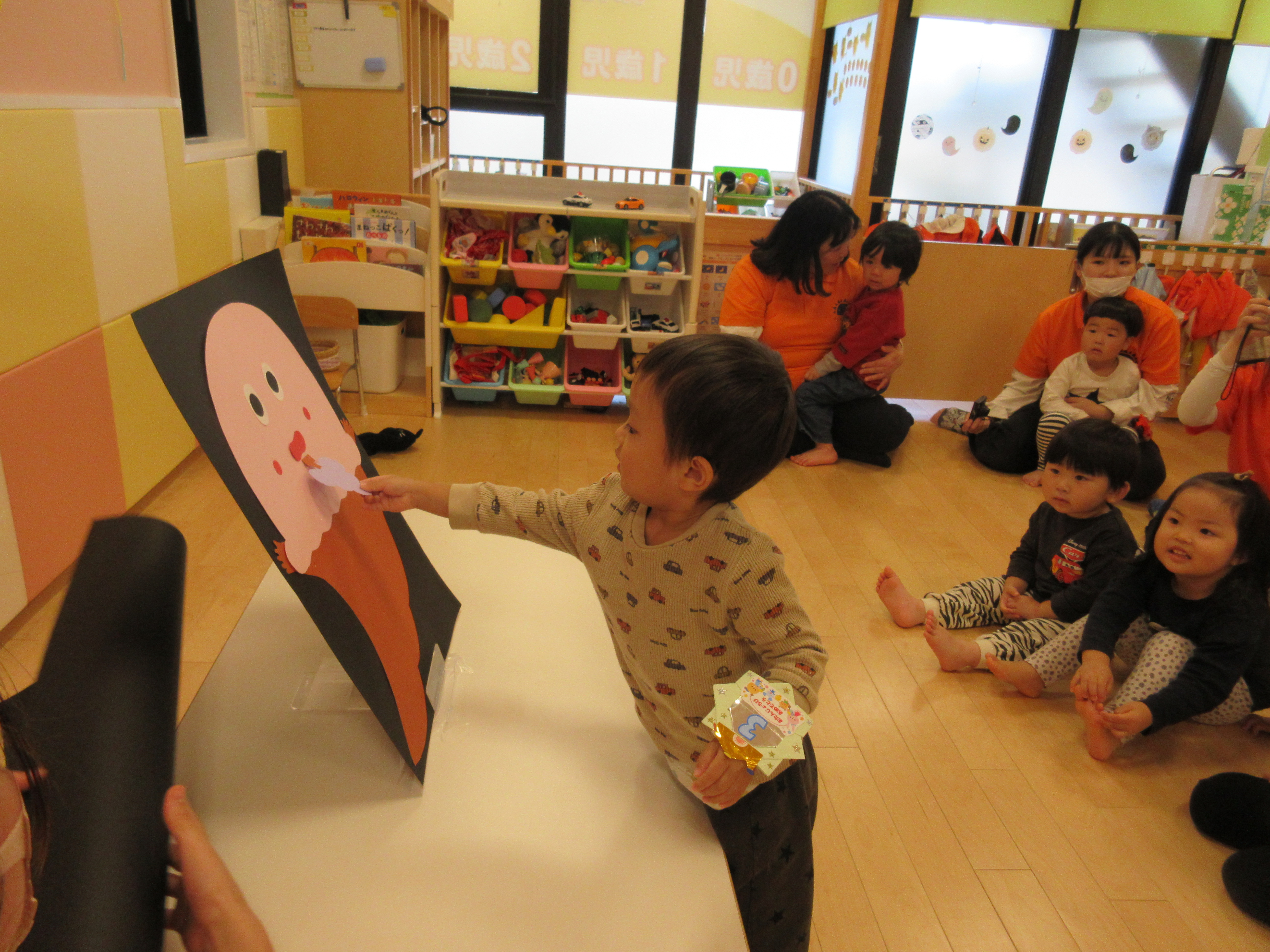 目や口を丸シール貼ってもらい、飾り付けをしました![]()