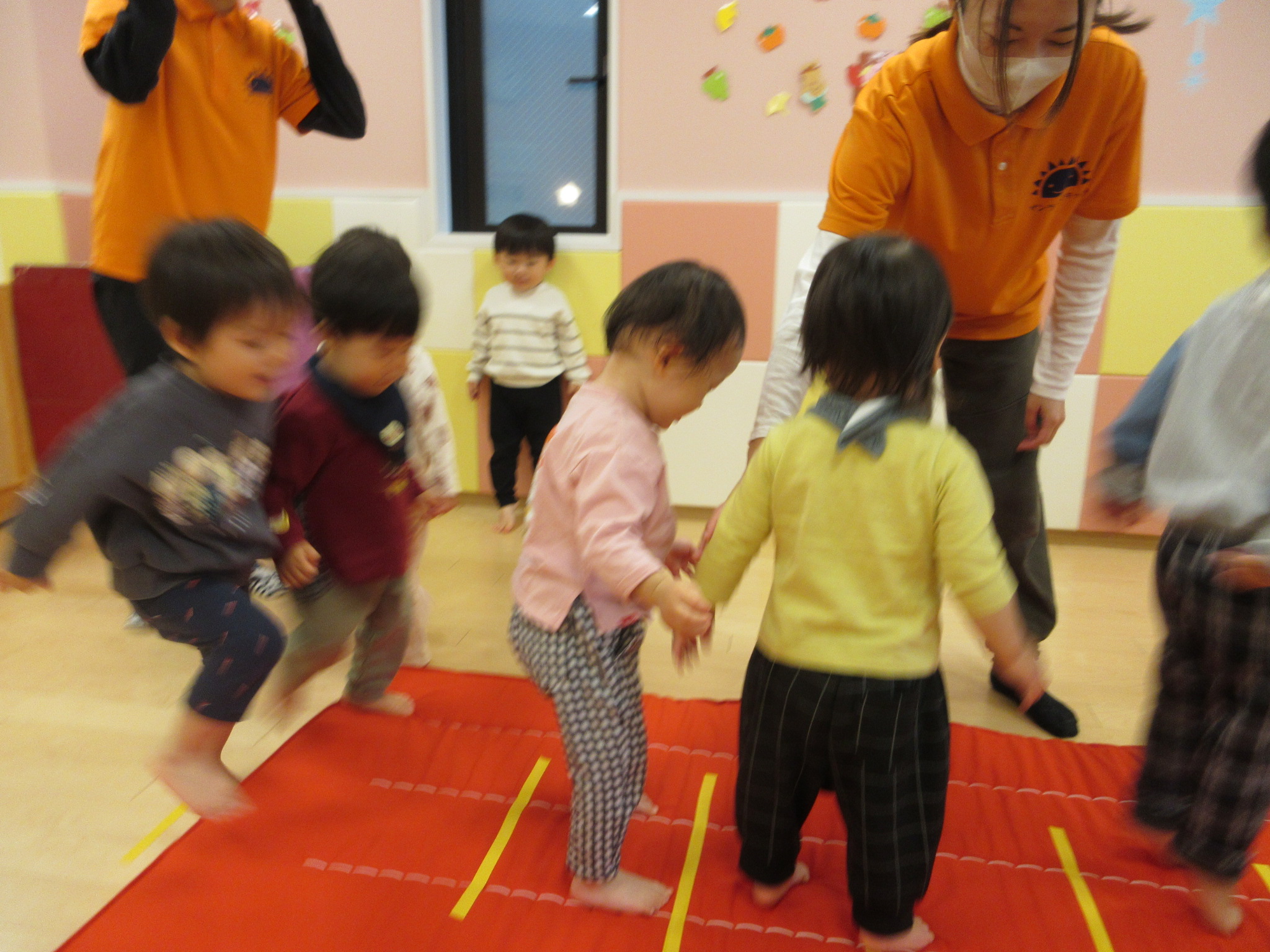 黄色い線の上を順番にジャンプして進んでいます!「ジャンプ!」と言いながらどの子も大はしゃぎで楽しんでいます!