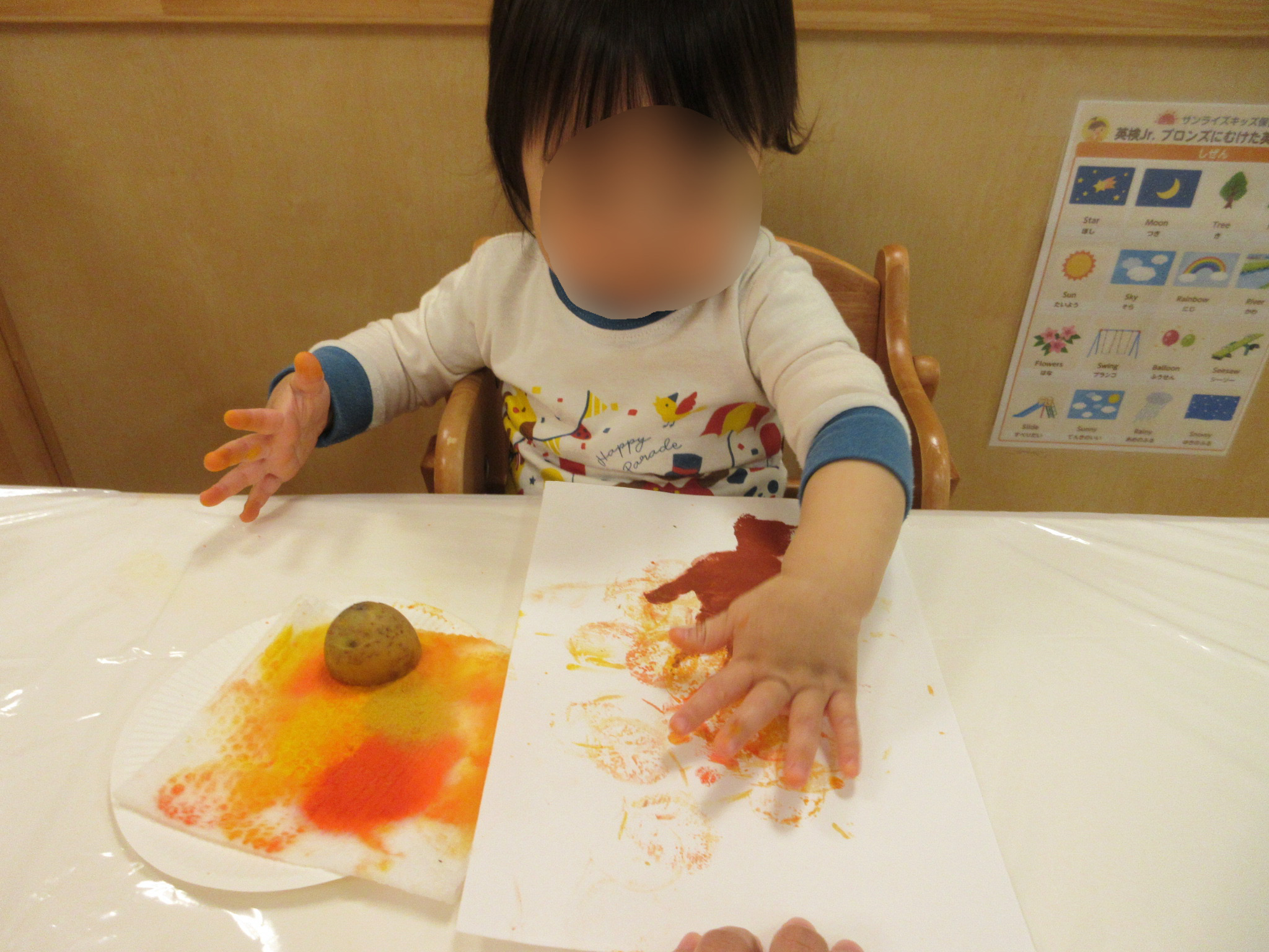 ↓じゃがいもでスタンプを楽しんだ後は、自分の手に絵の具をつけて画用紙にペタペタ![]()