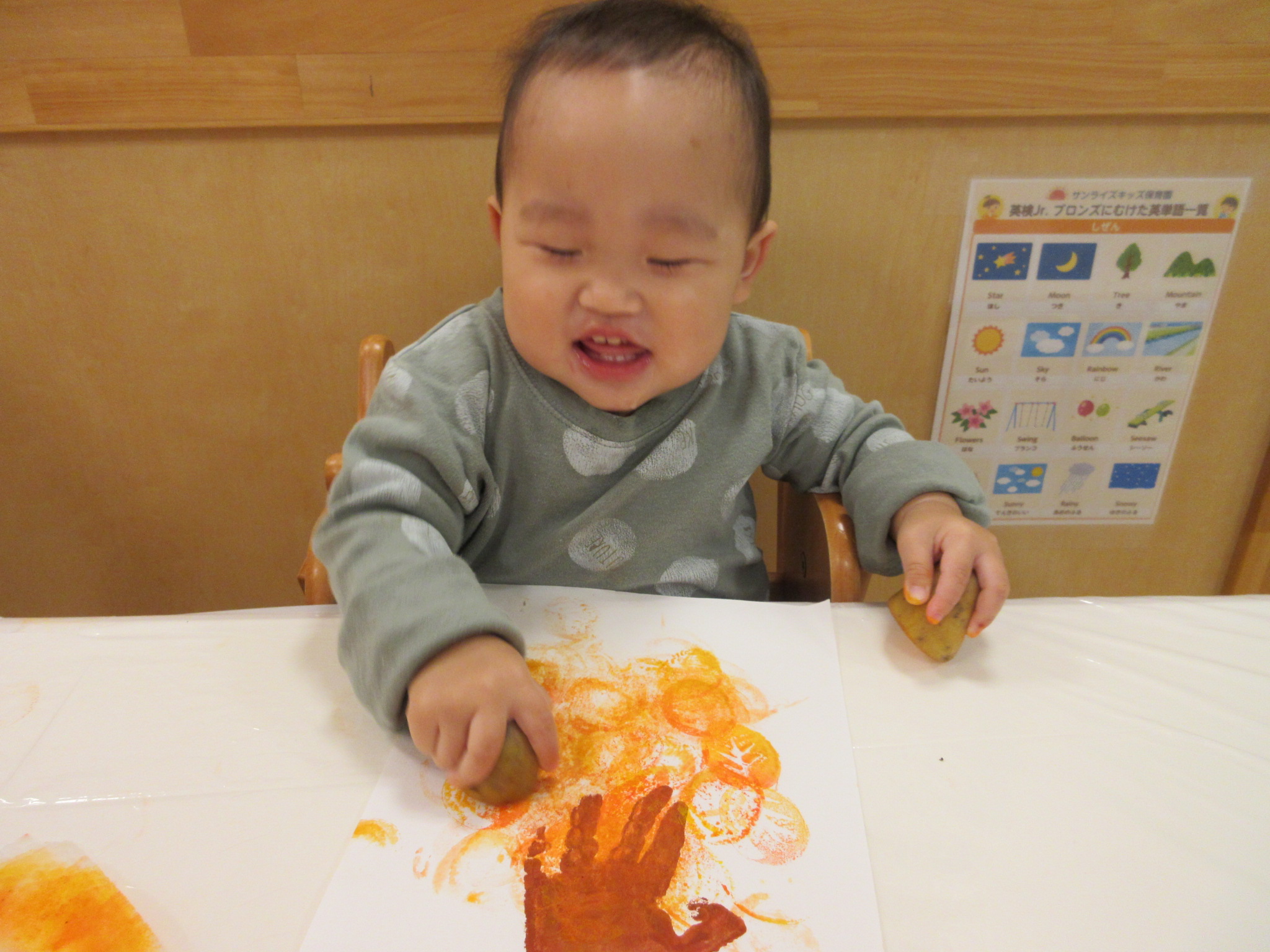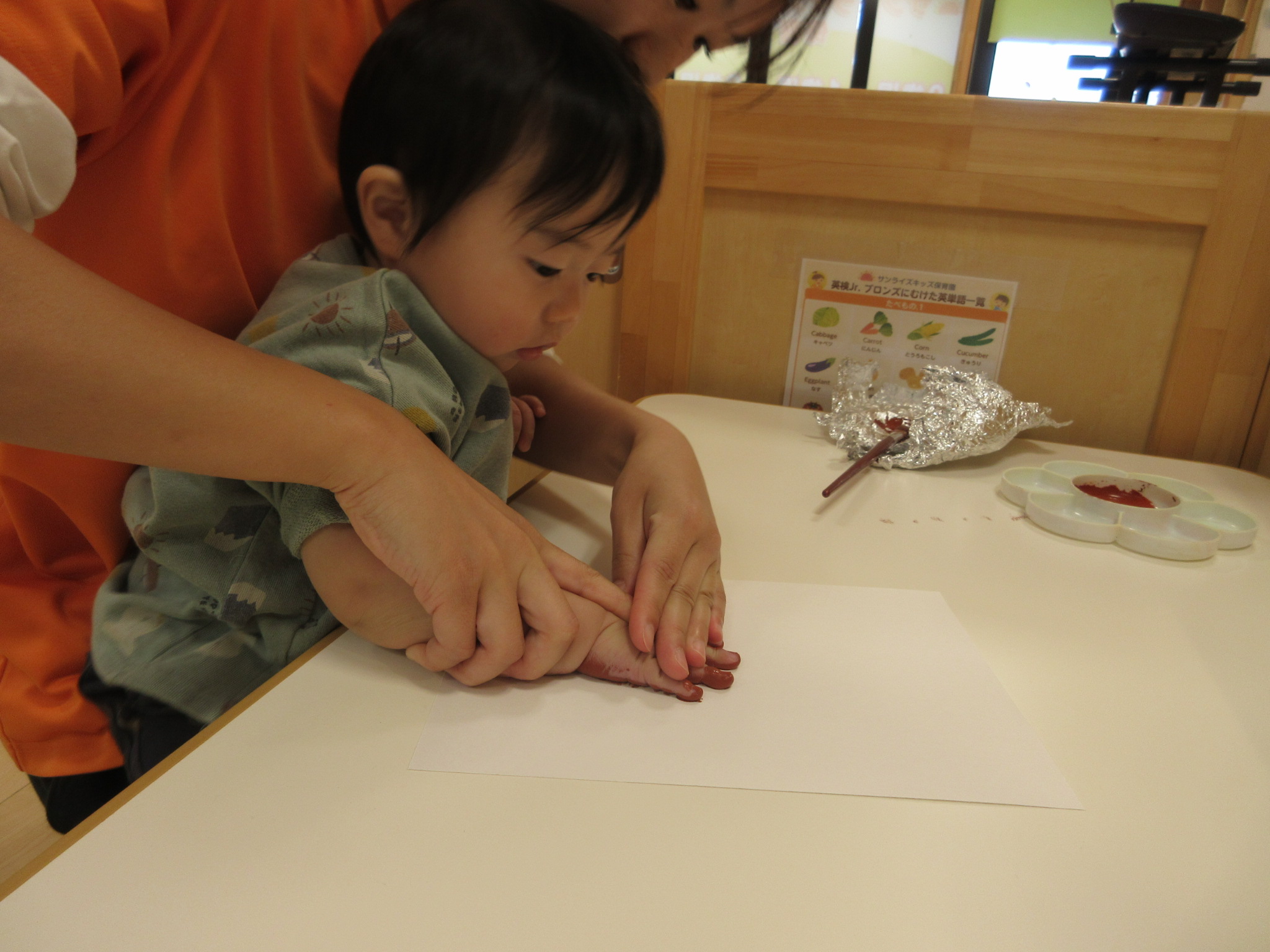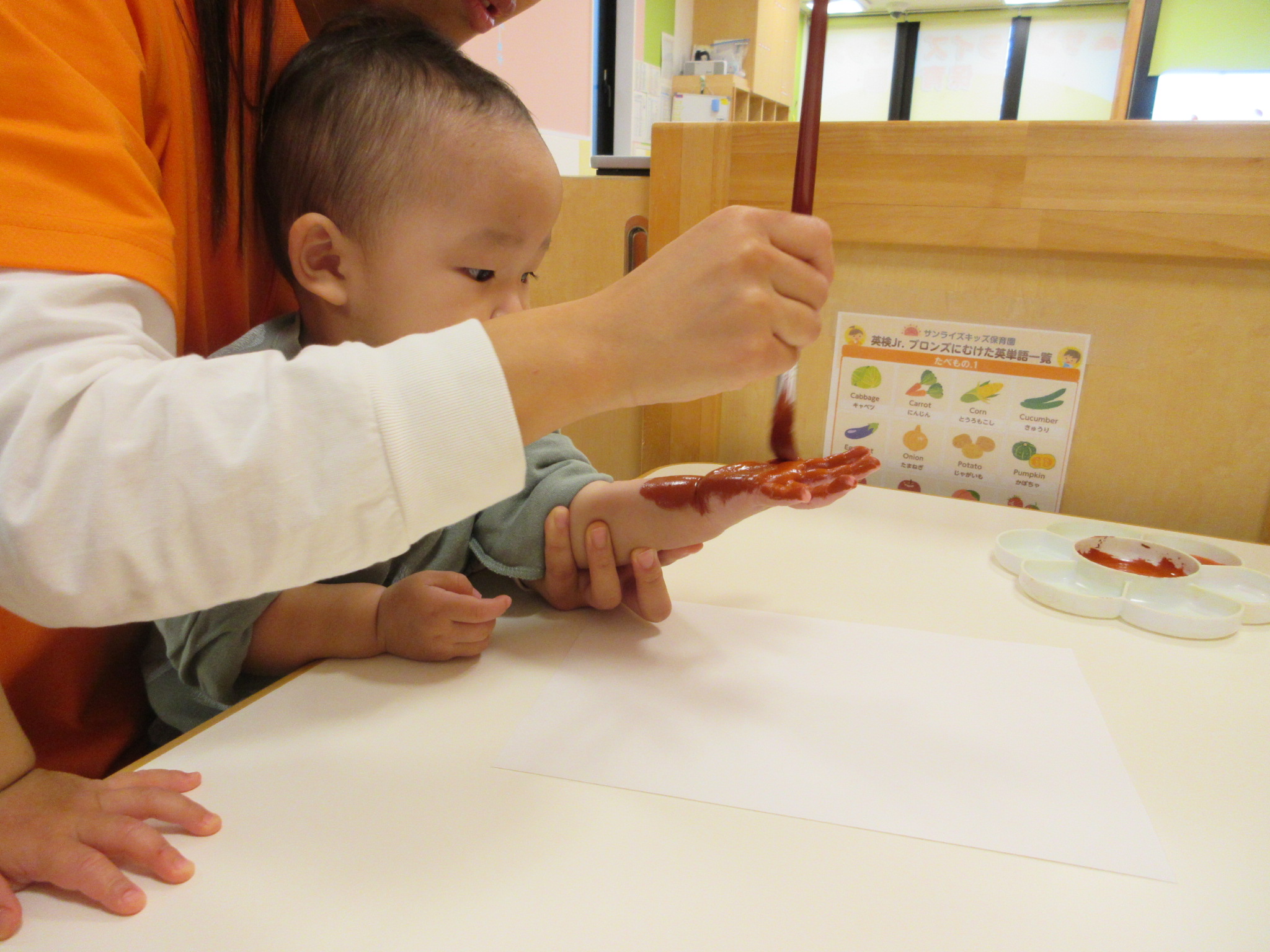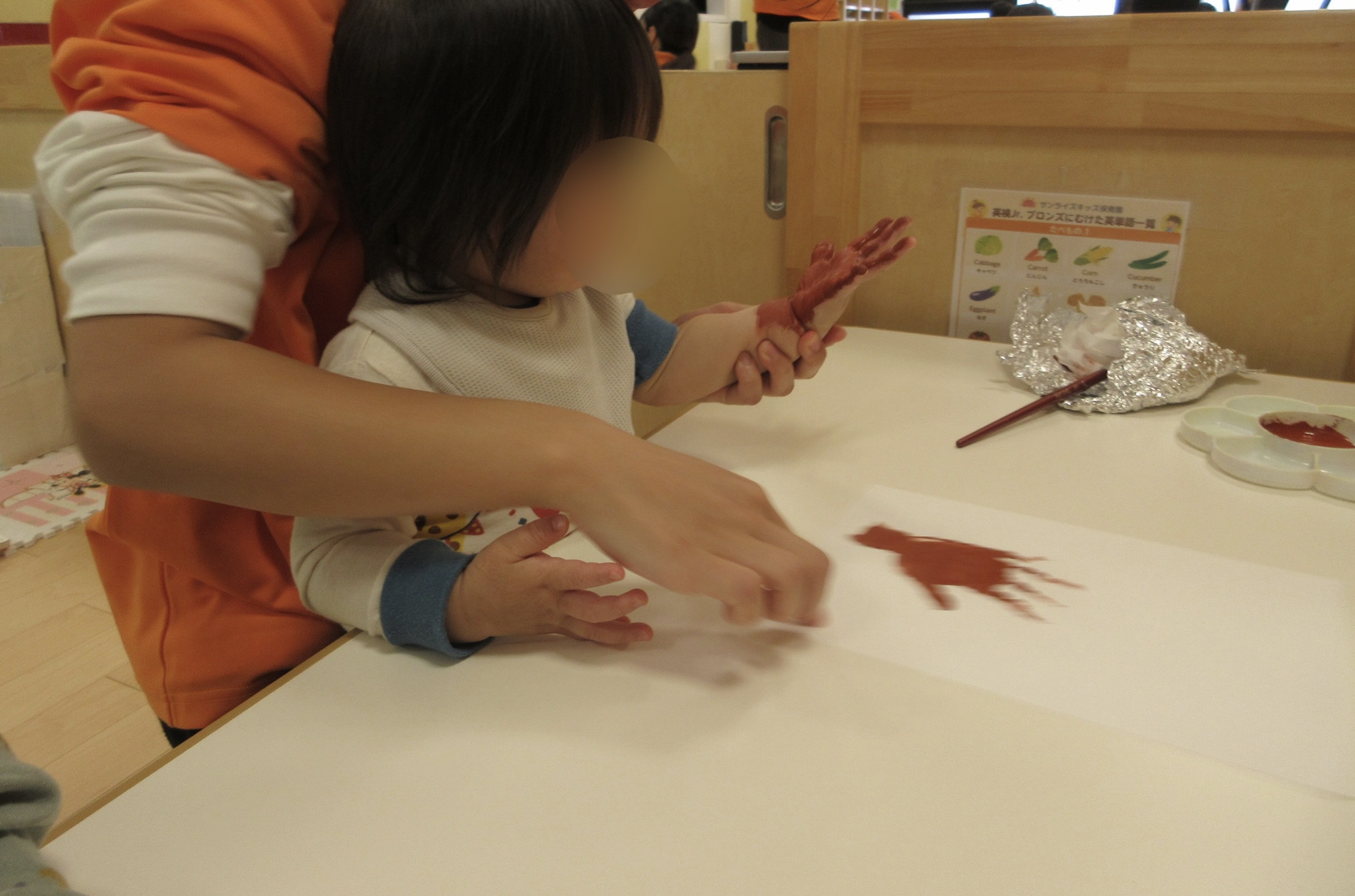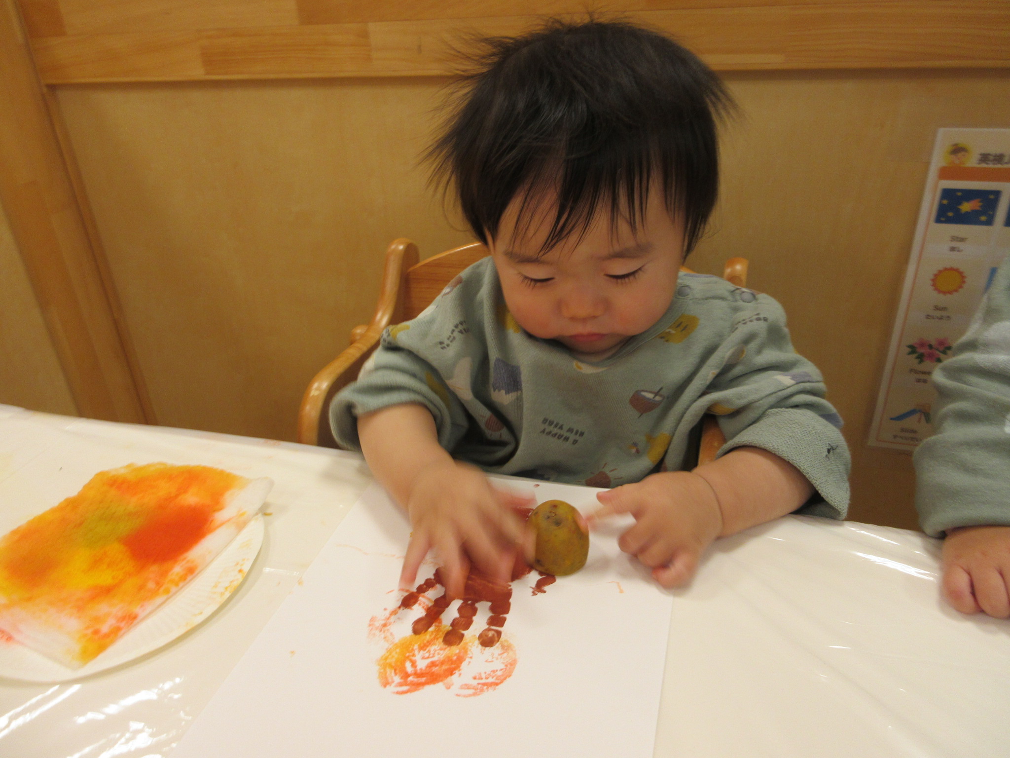 久しぶりの手形でも、絵の具を手のひらに塗っていても平気な様子の子どもたち![]()