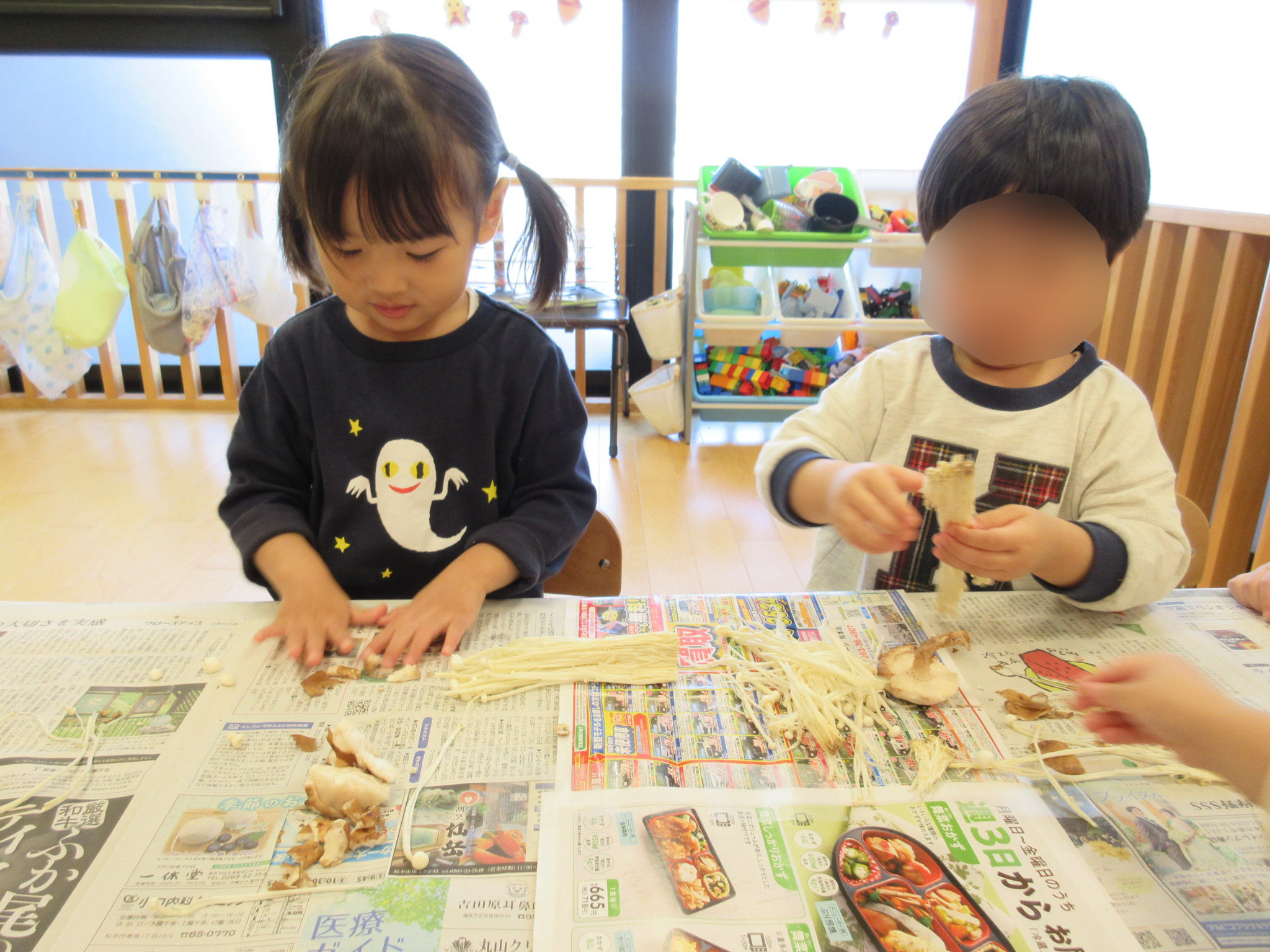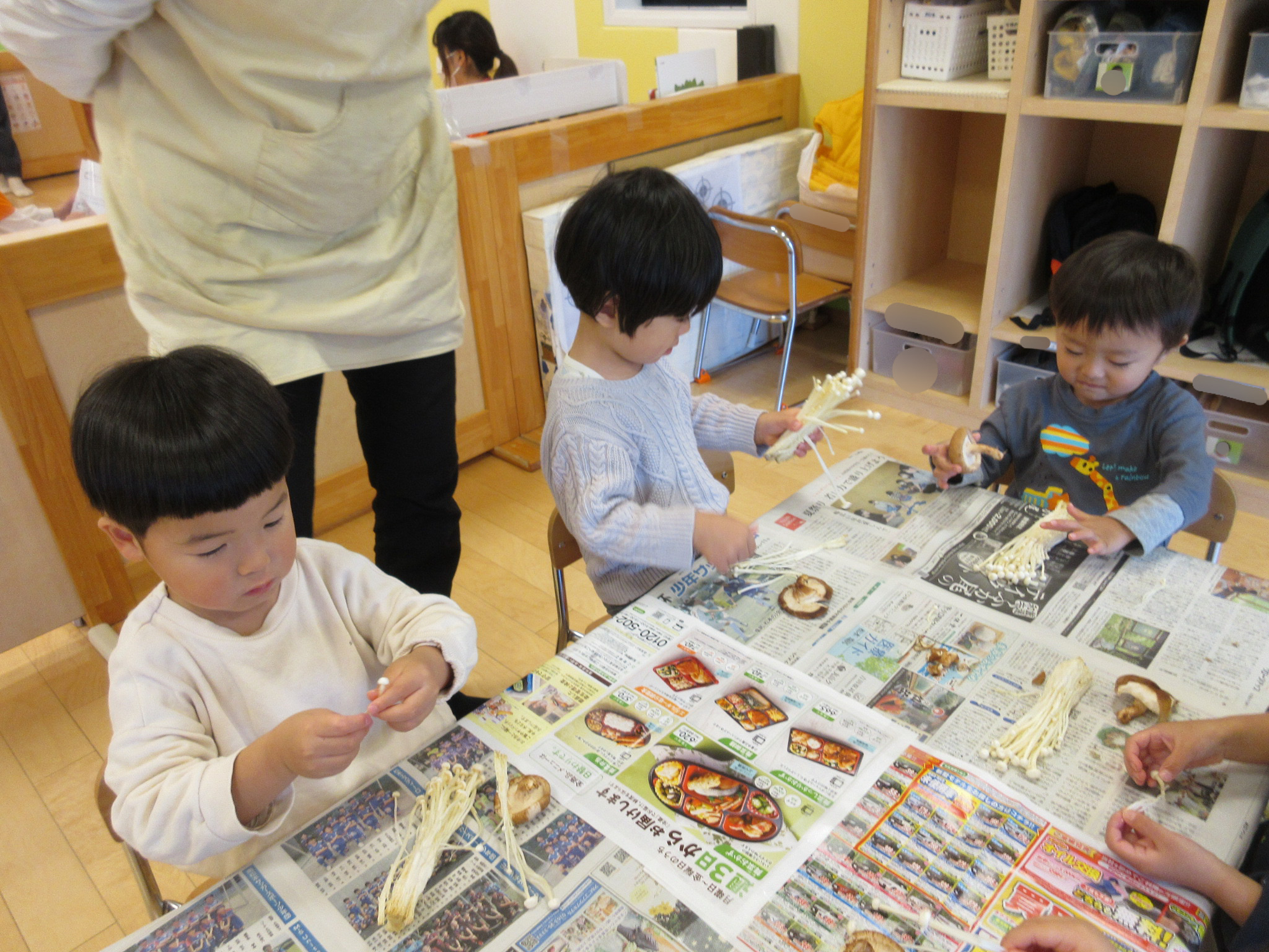 きのこを細く割いてみている子や