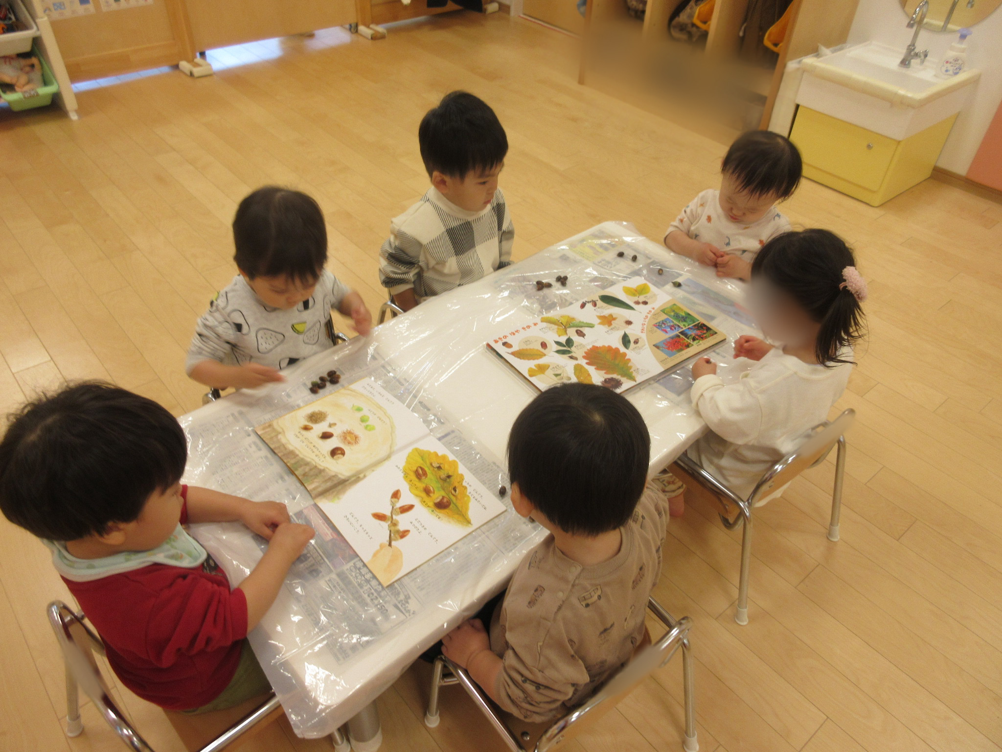 また、別日には拾ったどんぐりを図鑑や絵本で見比べて観察もしてみました![]()