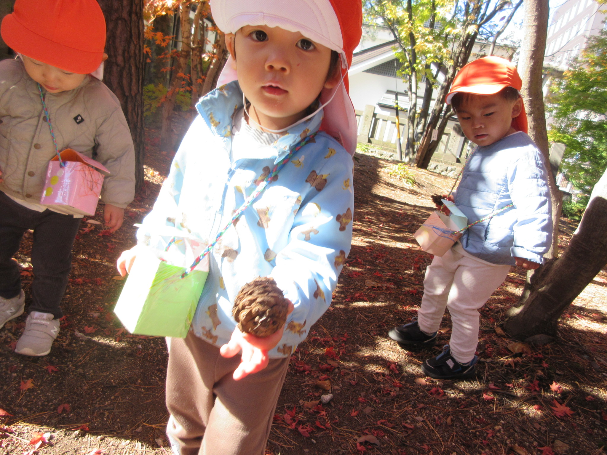 どんぐりを拾ったり、松ぼっくりを拾っていた子どもたち![]()