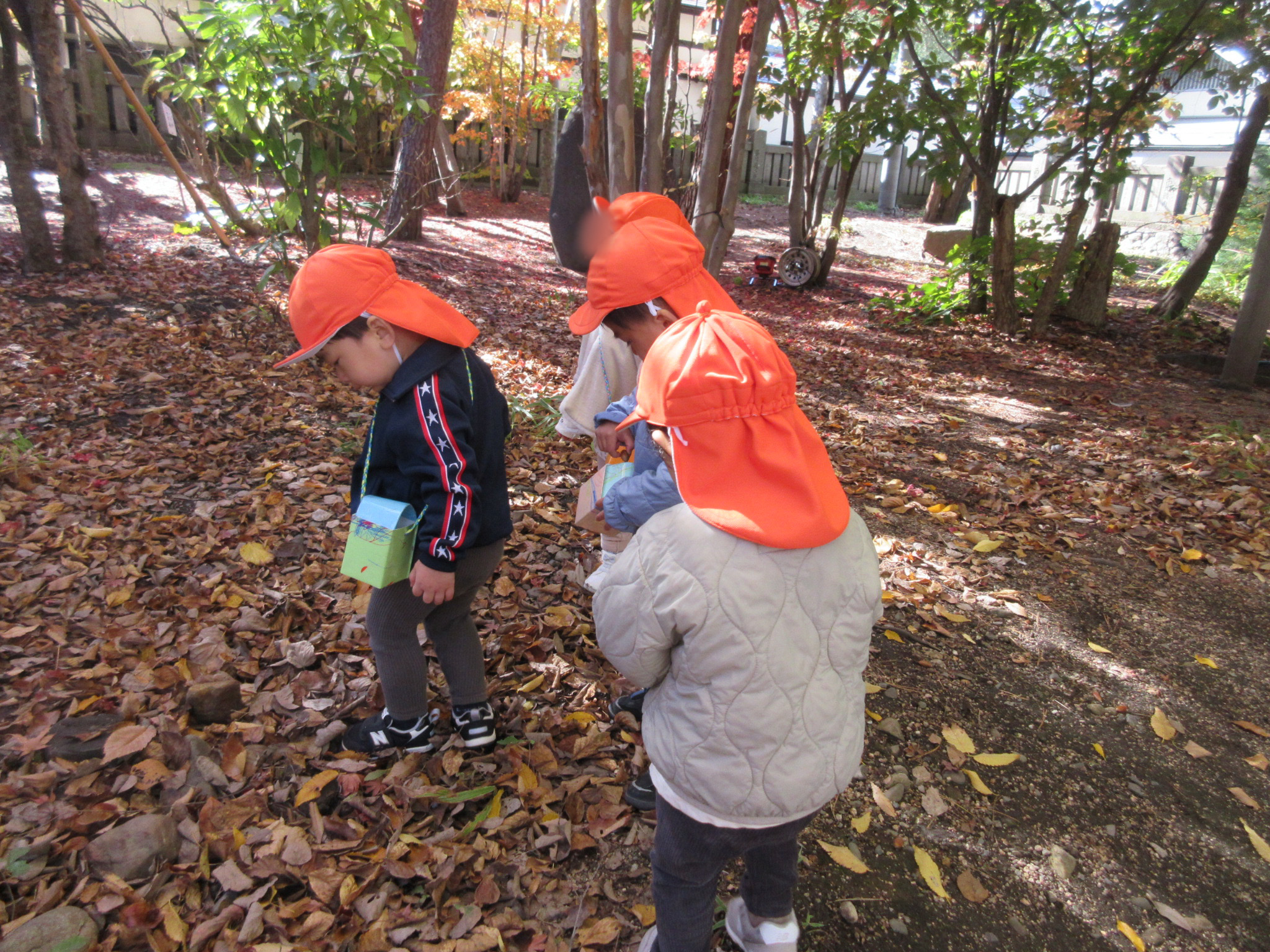 ↓落ち葉も沢山落ちていて、落ち葉の上を歩いて感触を確かめていた子たちもいました![]()