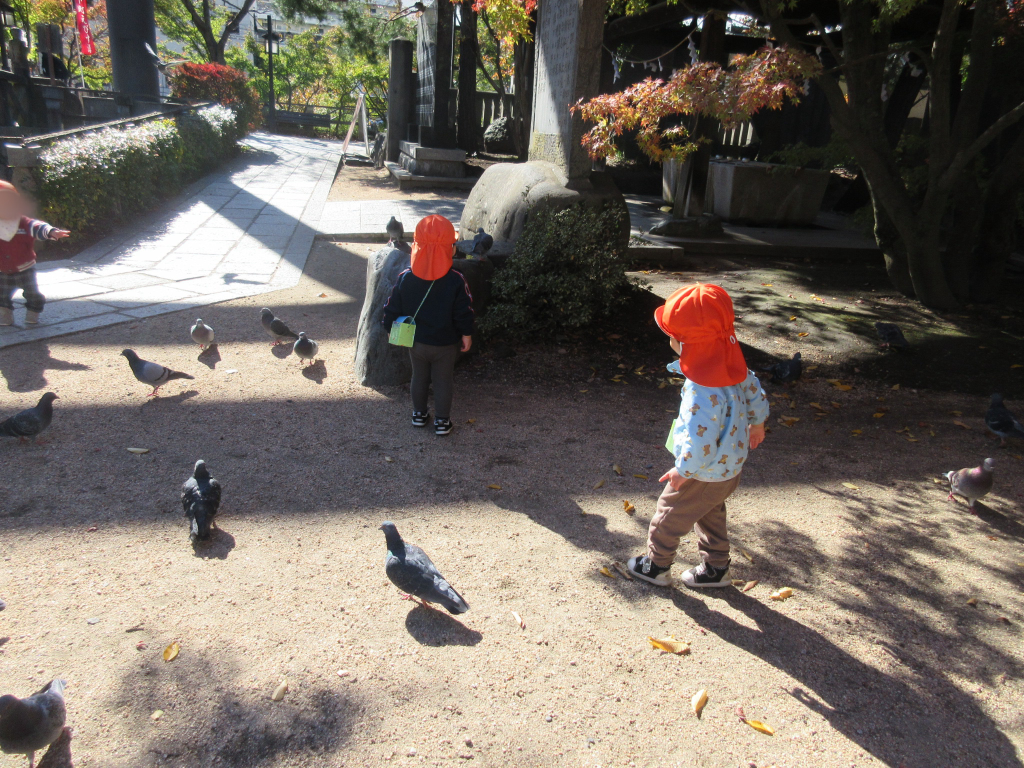 ↓みんなでぎゅっと集まっていて、どうしたのかな?と思っていると…。どうやら沢山いたハトが怖かったようで遠目に様子を見ていました