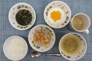 (写真は離乳食後期です。年齢によって形、固さ、盛り付け量を変えて、提供しています。)