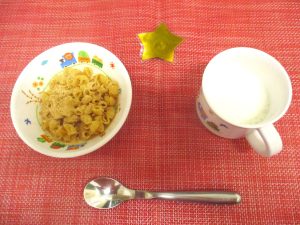(写真は離乳食後期です。年齢によって形、固さ、盛り付け量を変えて、提供しています。)