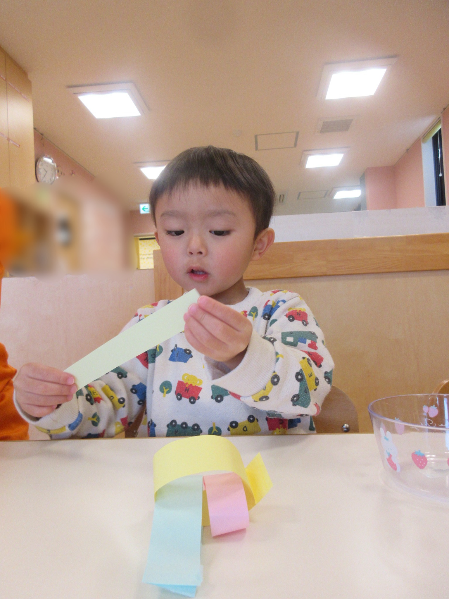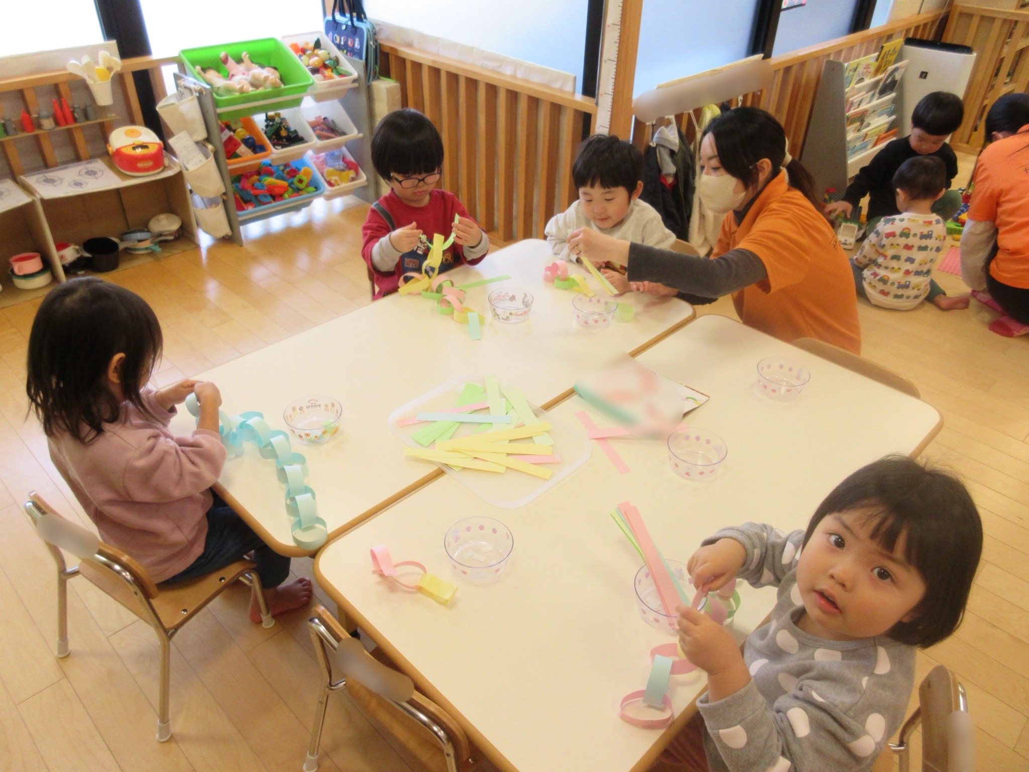 細長く切られた画用紙の中から好きな色を選び、丸くして繋げていく子どもたち。