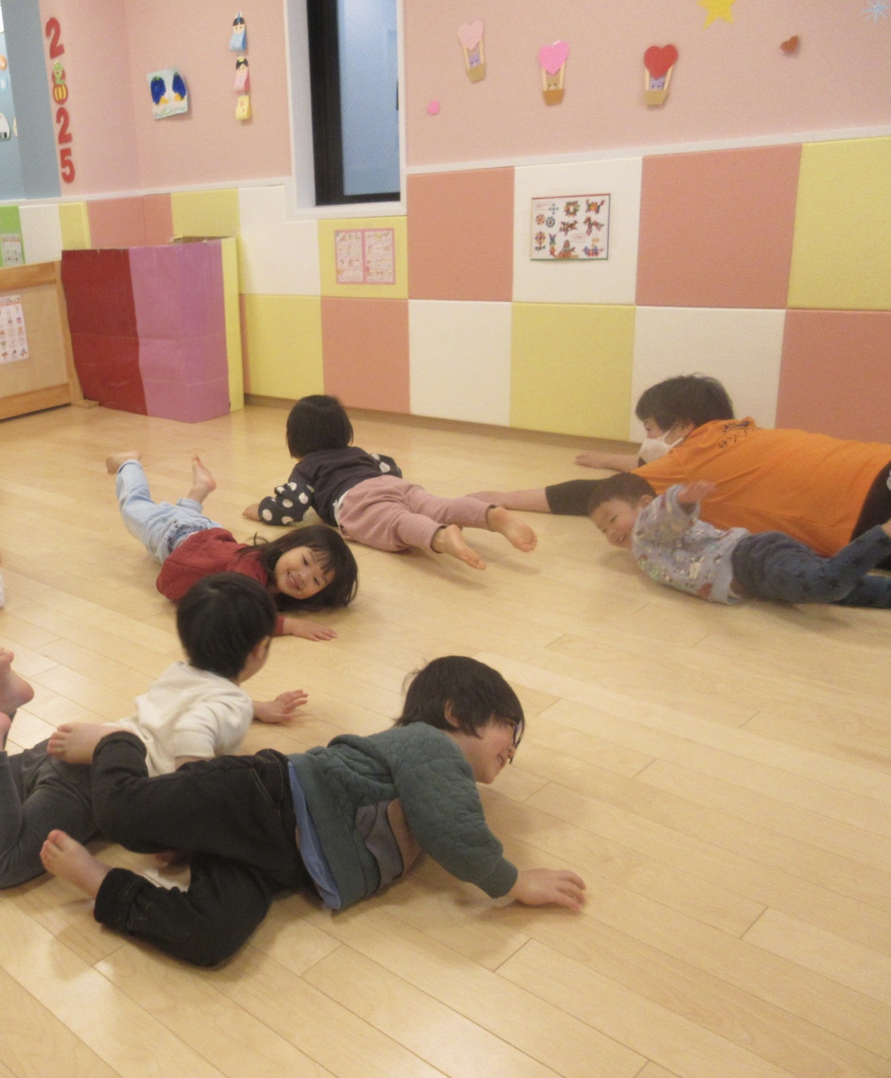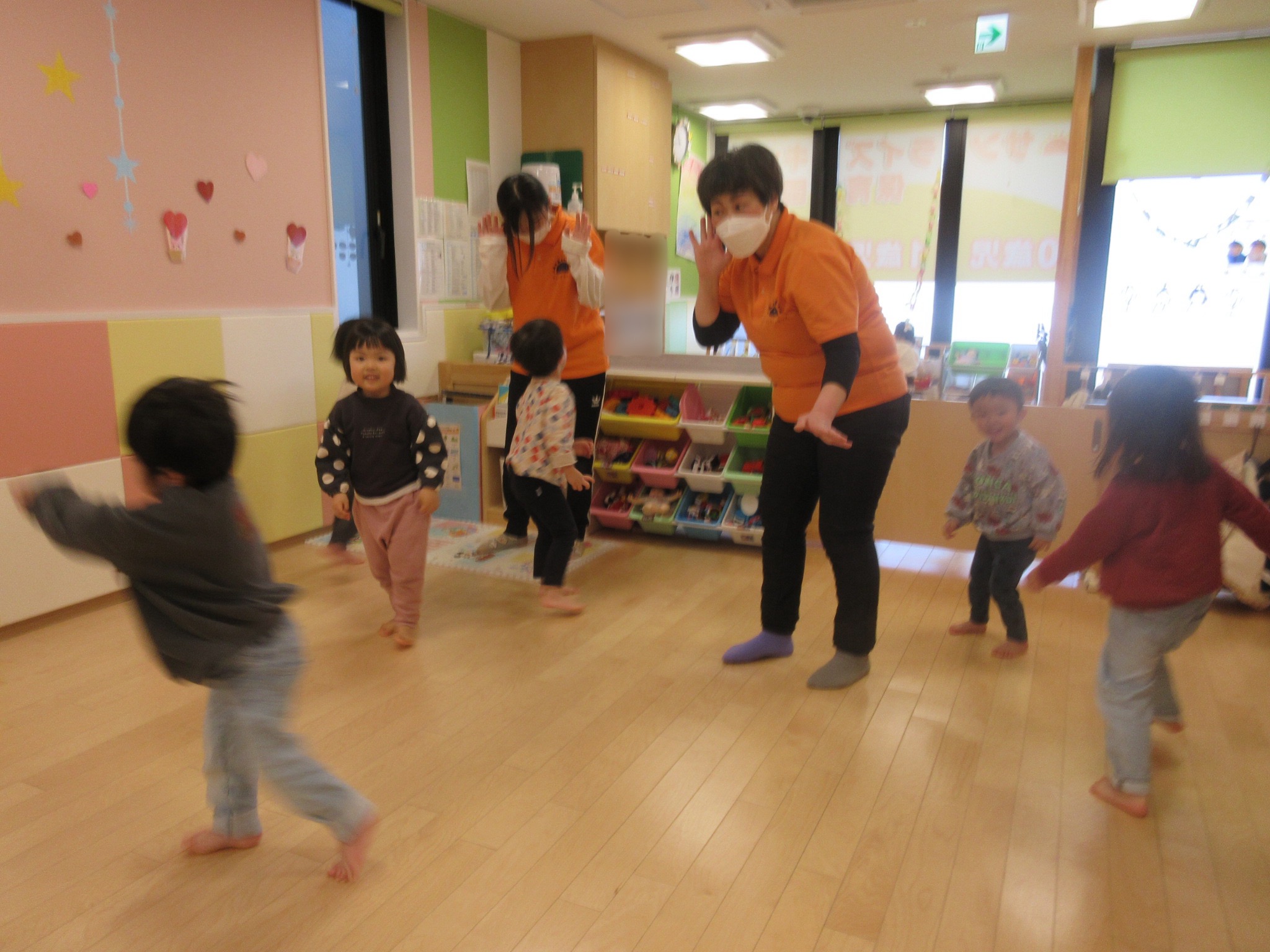 寒い日が続き、なかなかお外で遊べる日がすくないですが、室内でも元気いっぱい身体を動かして遊んでいるりんごぐみさんです