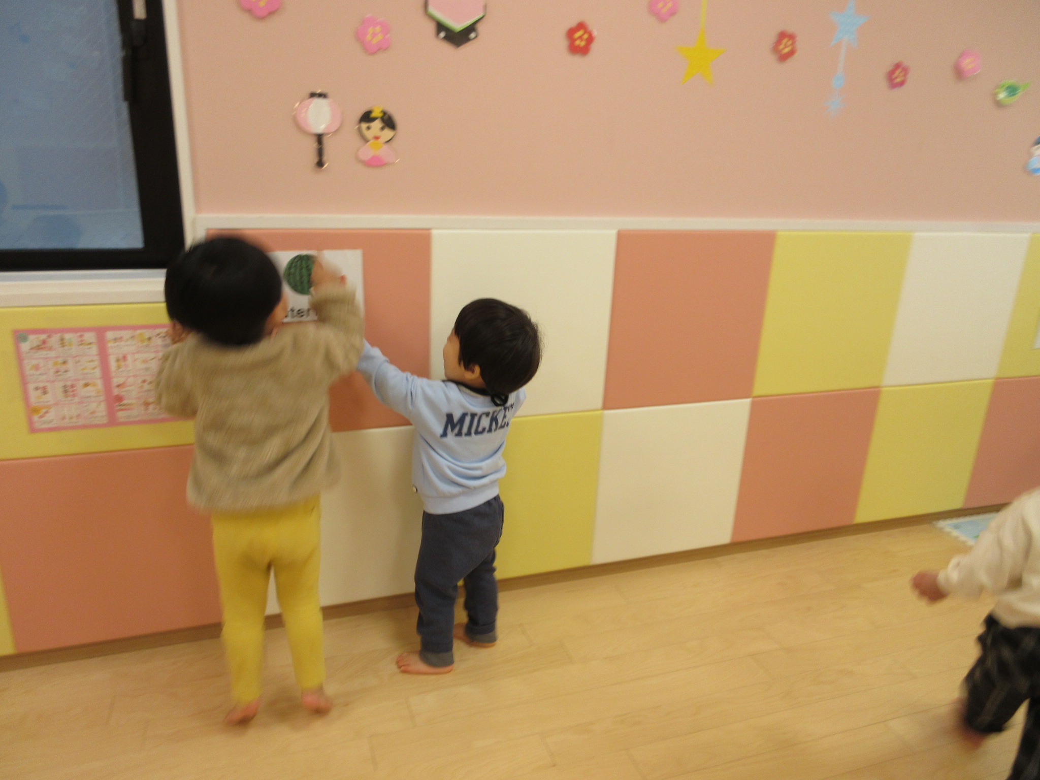 その後はアクティビティとして、お部屋に果物のフラッシュカードを貼り、先生が言った果物を探してカードにタッチ![]()