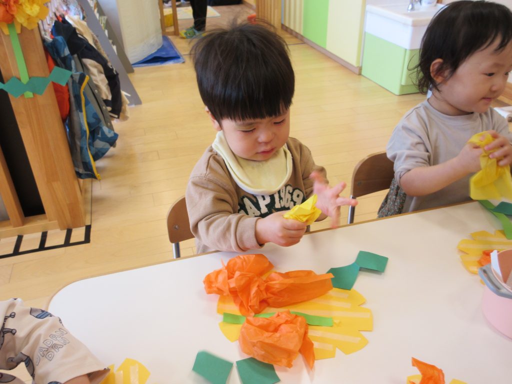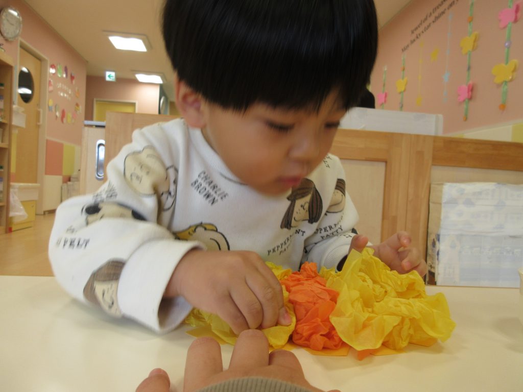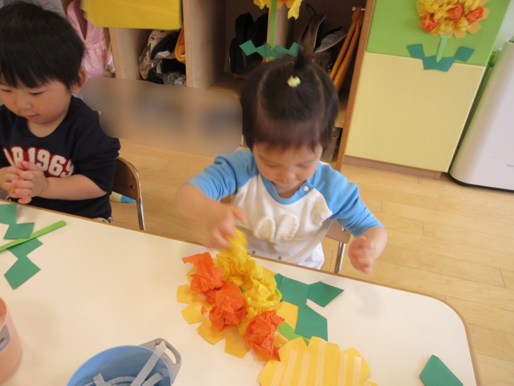 次は、オレンジと黄色の花紙をくしゃくしゃ丸めてお花を作っていきます。