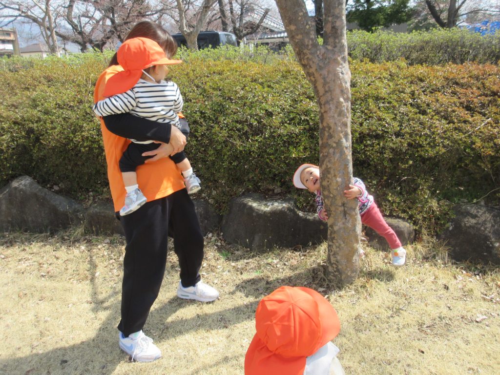 木の影に隠れて”いないいないばぁ”をするお友だち![]()