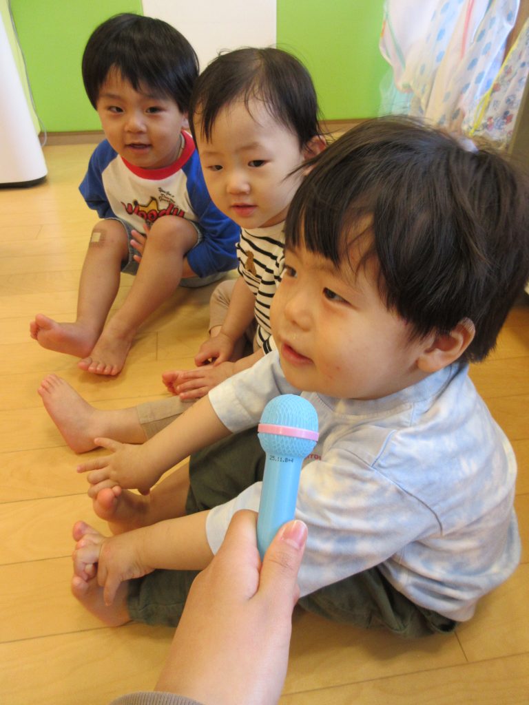 次に、マイクを使って「あなたのお名前は??」と聞いいくと