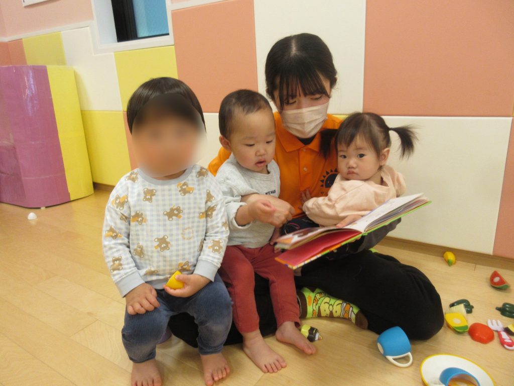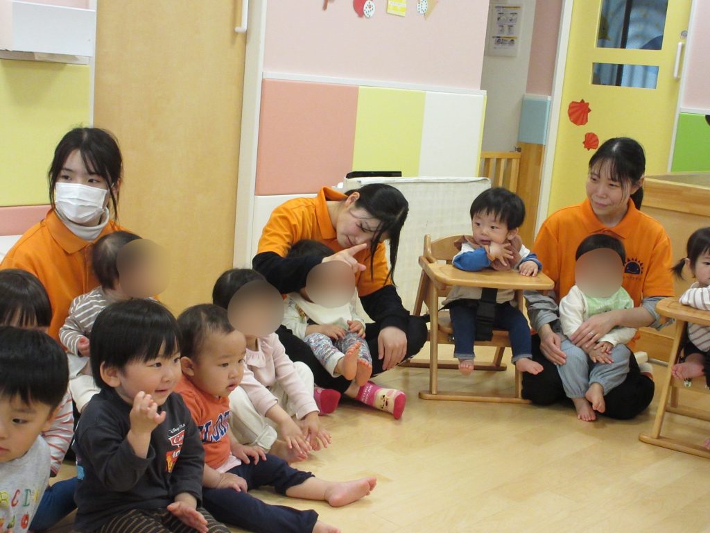 保育士の膝に座り、みんなで楽しんでいますよ