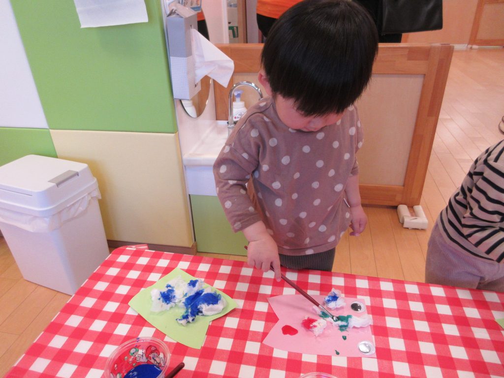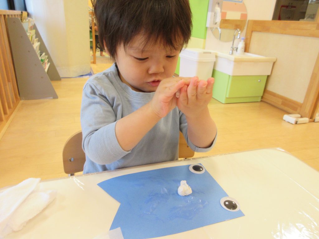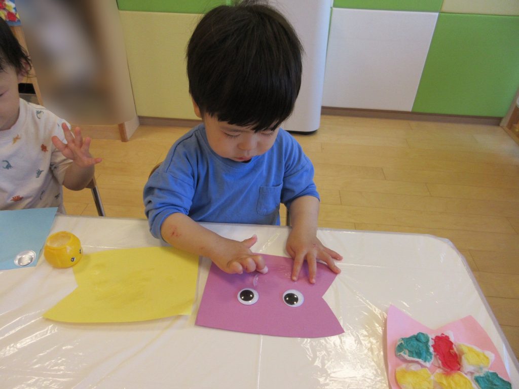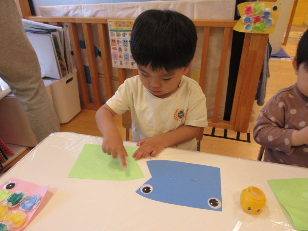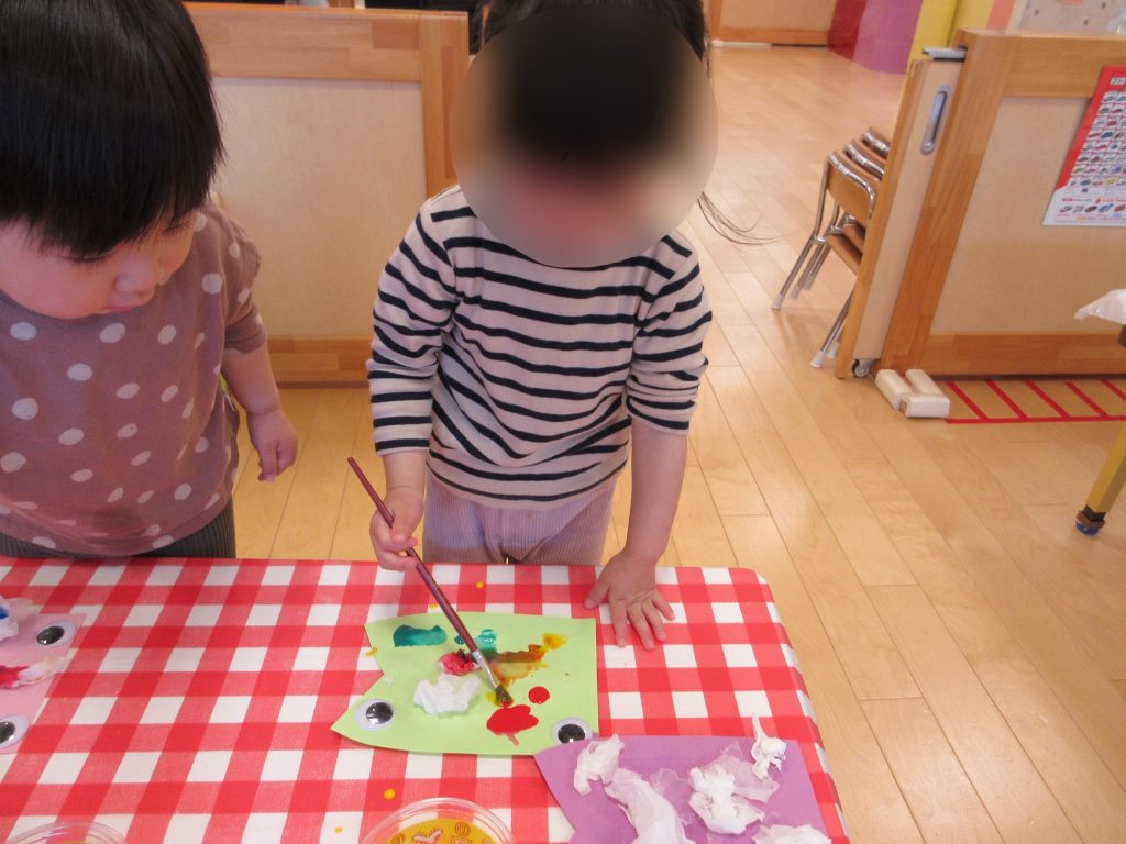 ちょんちょんとティッシュに絵の具を塗り、色が広がっていく様子を楽しそうに見ている姿がありましたよ