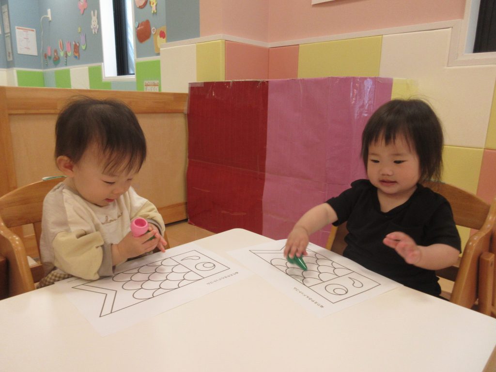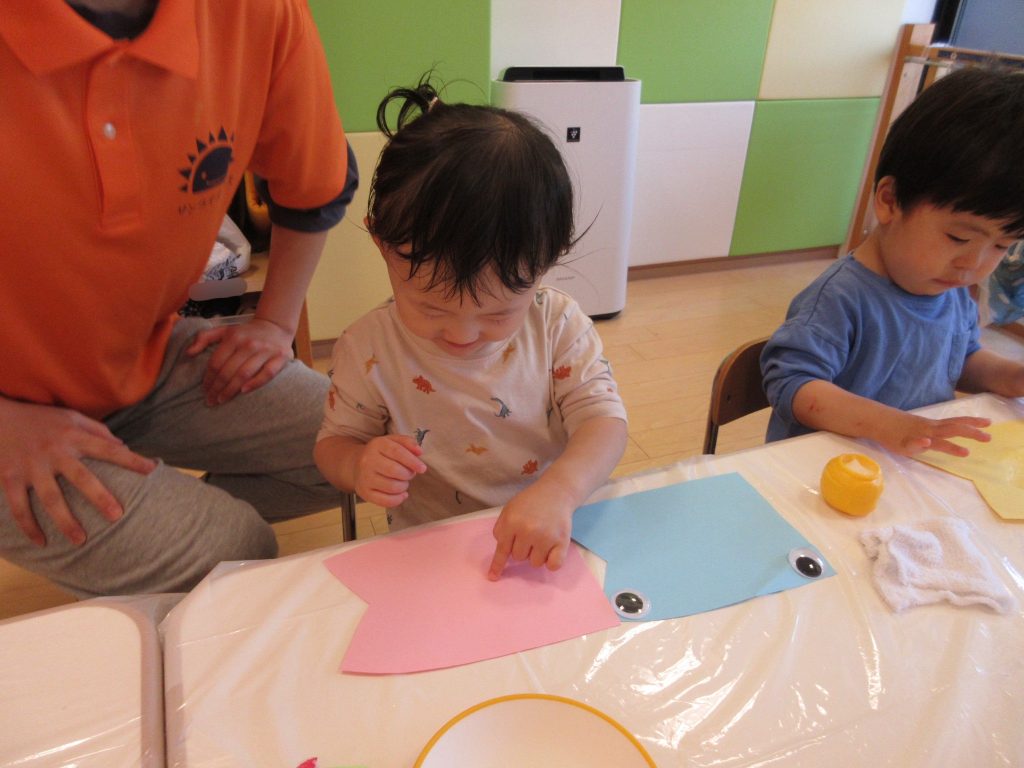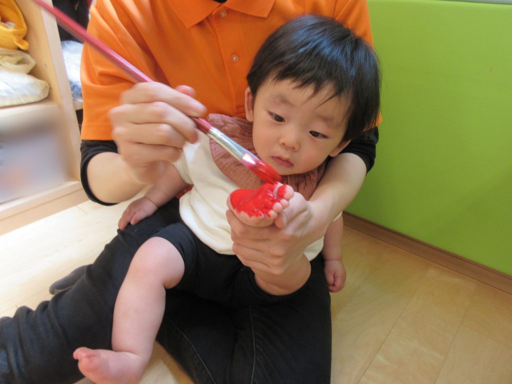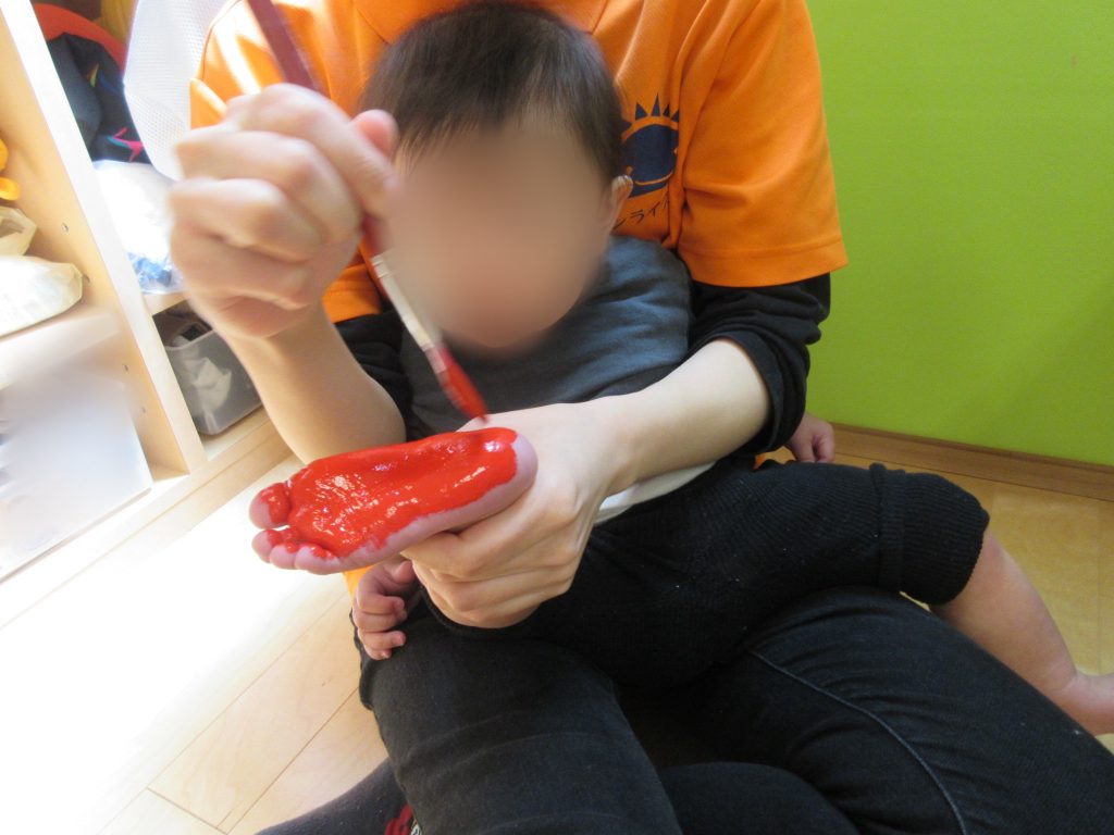 また、鯉のぼりの製作もしました!初めて足型を取ったのですが、足に絵の具が広がっていく様子を一生懸命見ていましたよ