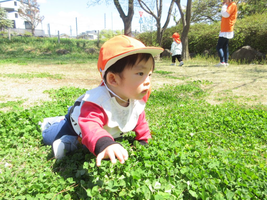 公園に着くと芝生の感触を楽しんだり、タンポポなどのお花も咲き始めているため、じっくりと観察をしています