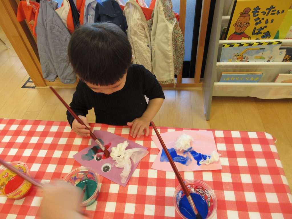 「やねよりたかいこいのぼり〜♪」とこいのぼりの歌を歌いながら、作っている子もいましたよのりをつける量を調整しながら上手に塗ることができました