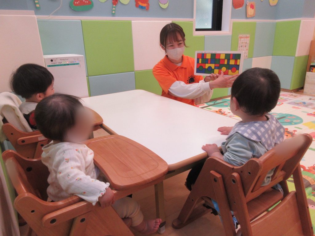 乗り物によって積み木の数が変わったり、沢山の色があるので、色を認識していくのにもいいかもしれませんね!また、少し年齢があがり、2歳児クラスの子どもたちなどは、クイズ形式で楽しむこともできると思います![]()