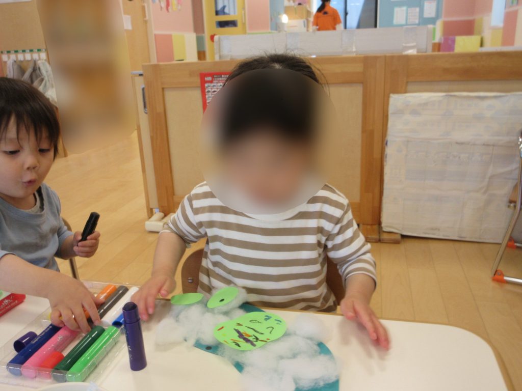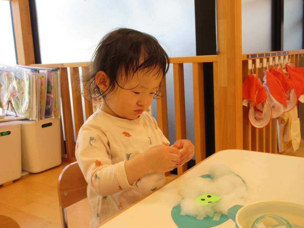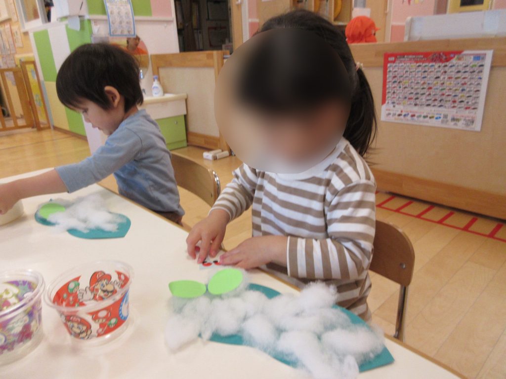 綿のふわふわした感触が気持ちいいのか、手のひらでコロコロ転がす子や画用紙にギュッと押さえつける子もいましたよ![]()