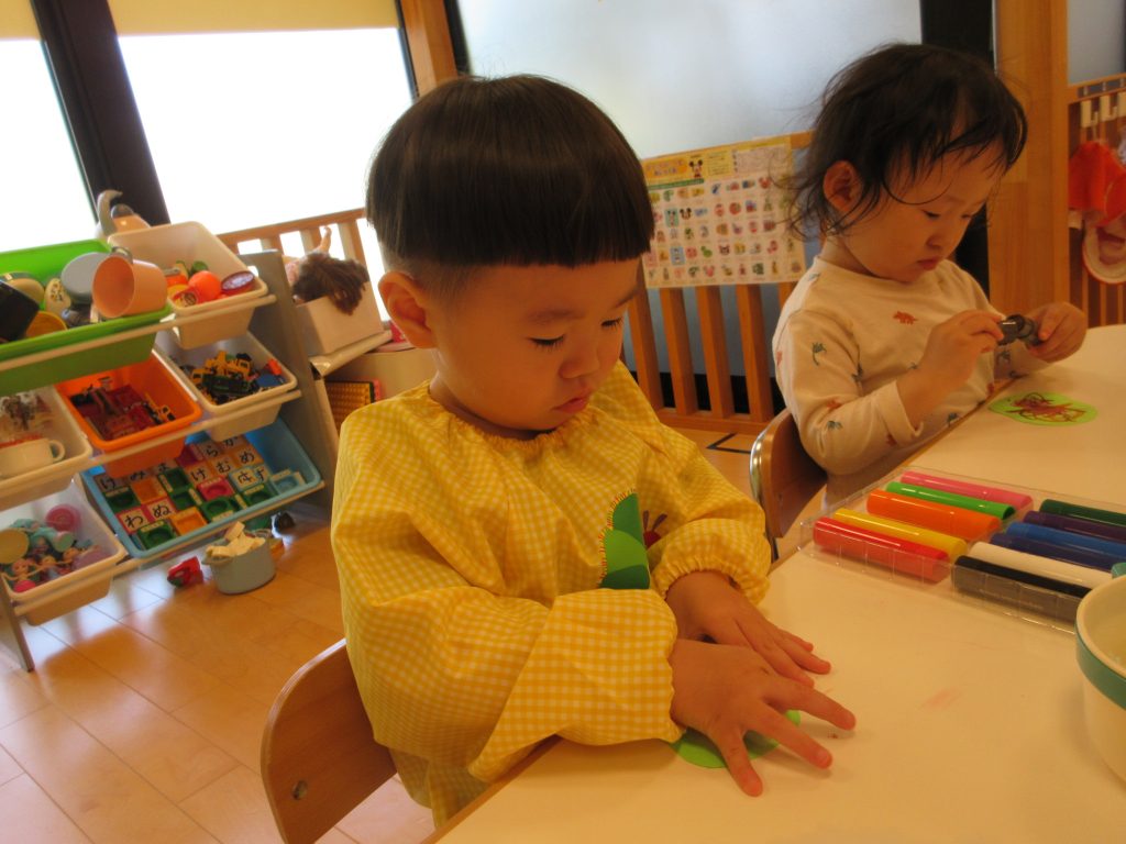 同じ色を何度も重ねる子や、チョンチョンと少しずつ色をつける子など、同じクレヨンでも様々な使い方をしていたりんご組さんです![]()