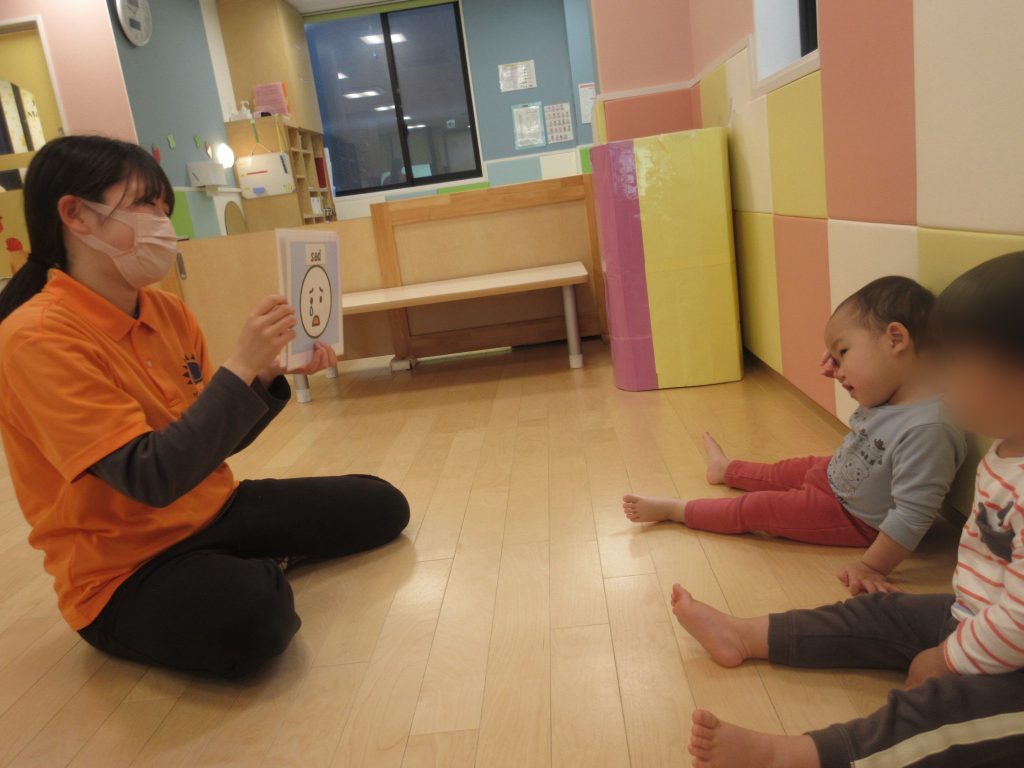 Sad,Happy,Hungryなどのカードがあり、カードの絵を見ながら仕草を真似っこしたり、一緒に発音しようとする姿がありましたよ