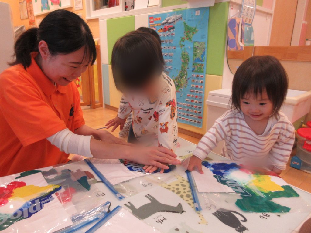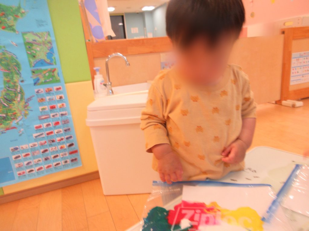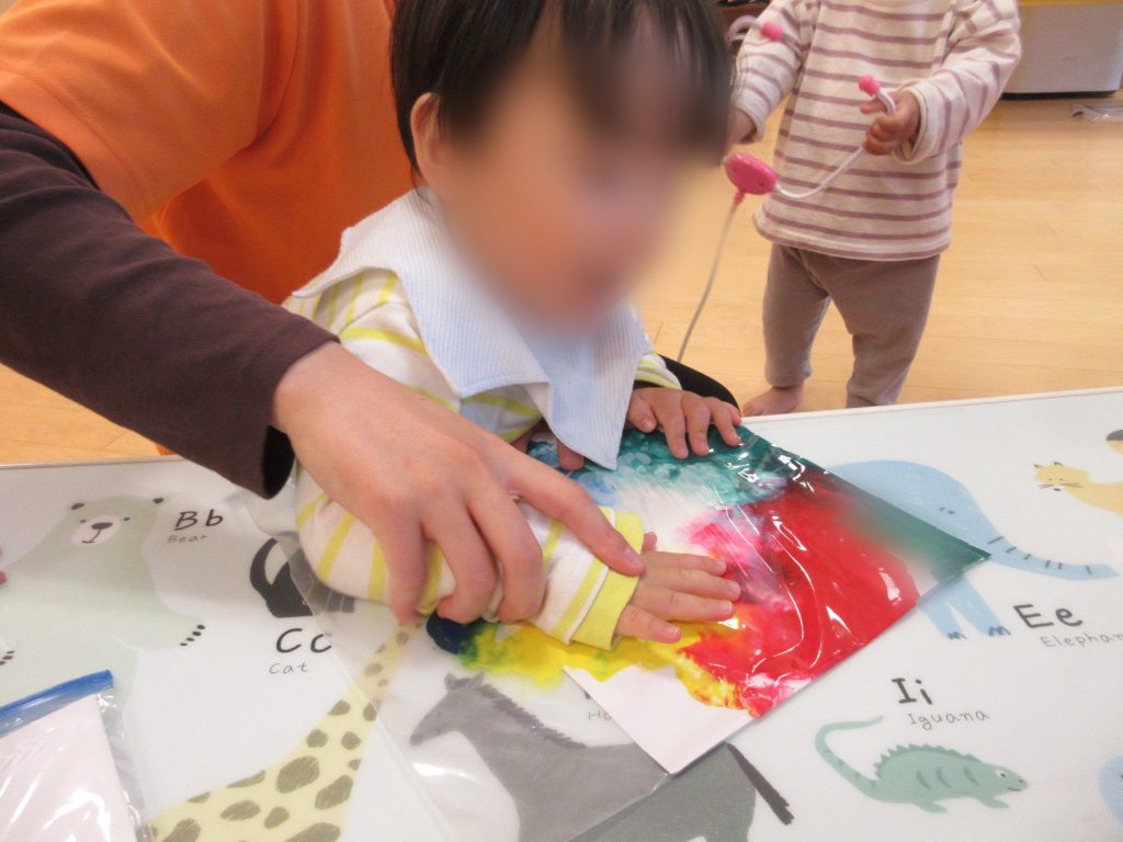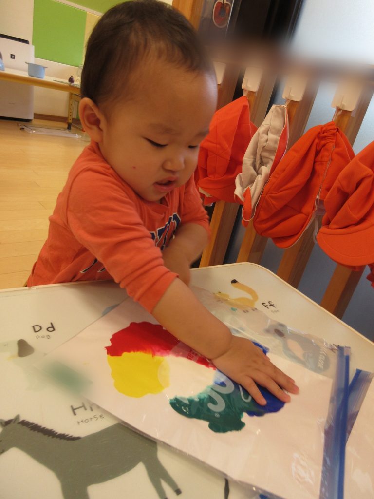 絵の具の感触や、手に絵の具が着かないことを不思議に思い首を傾げながらも、ニコニコで取り組んでいました。