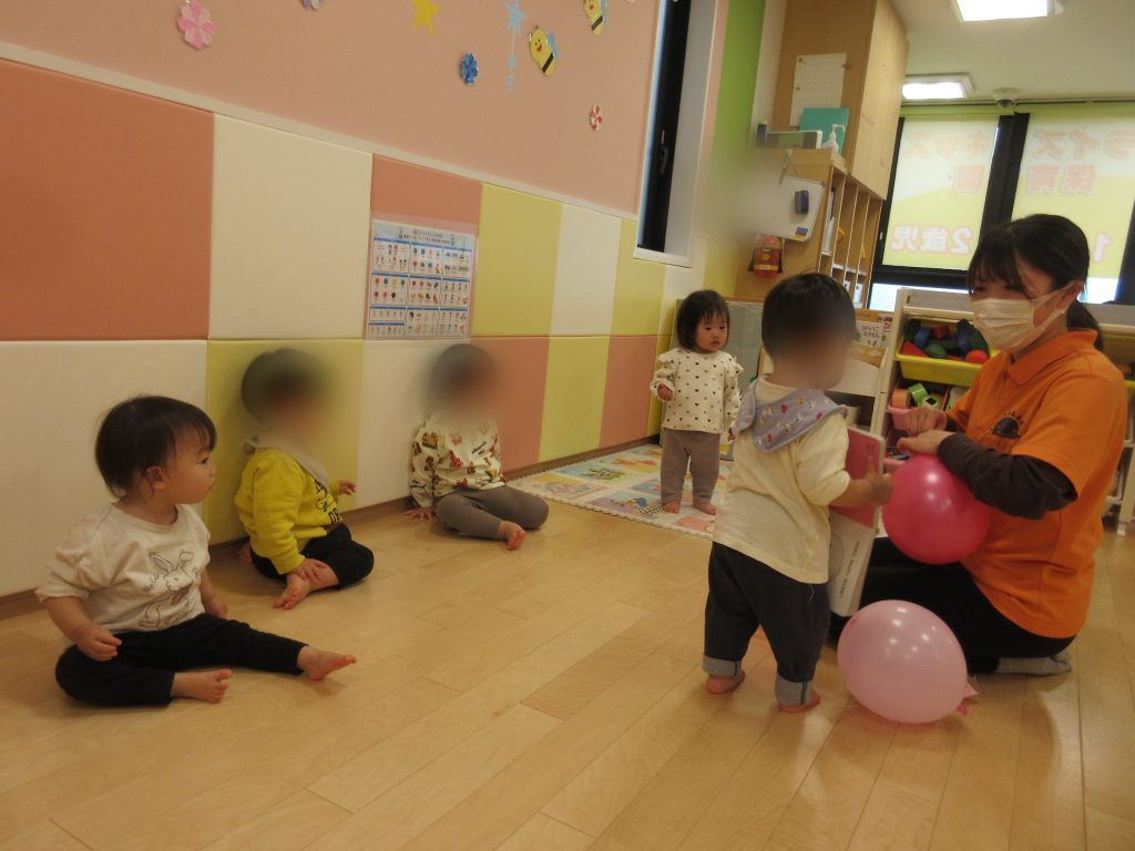 保育士が風船を膨らませると、興味津々な様子で見つめる子どもたち。
