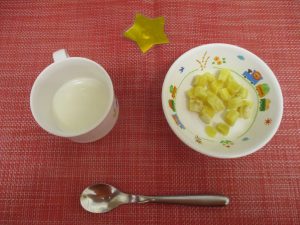 (写真は離乳食後期です。年齢によって形、固さ、盛り付け量を変えて、提供しています。)