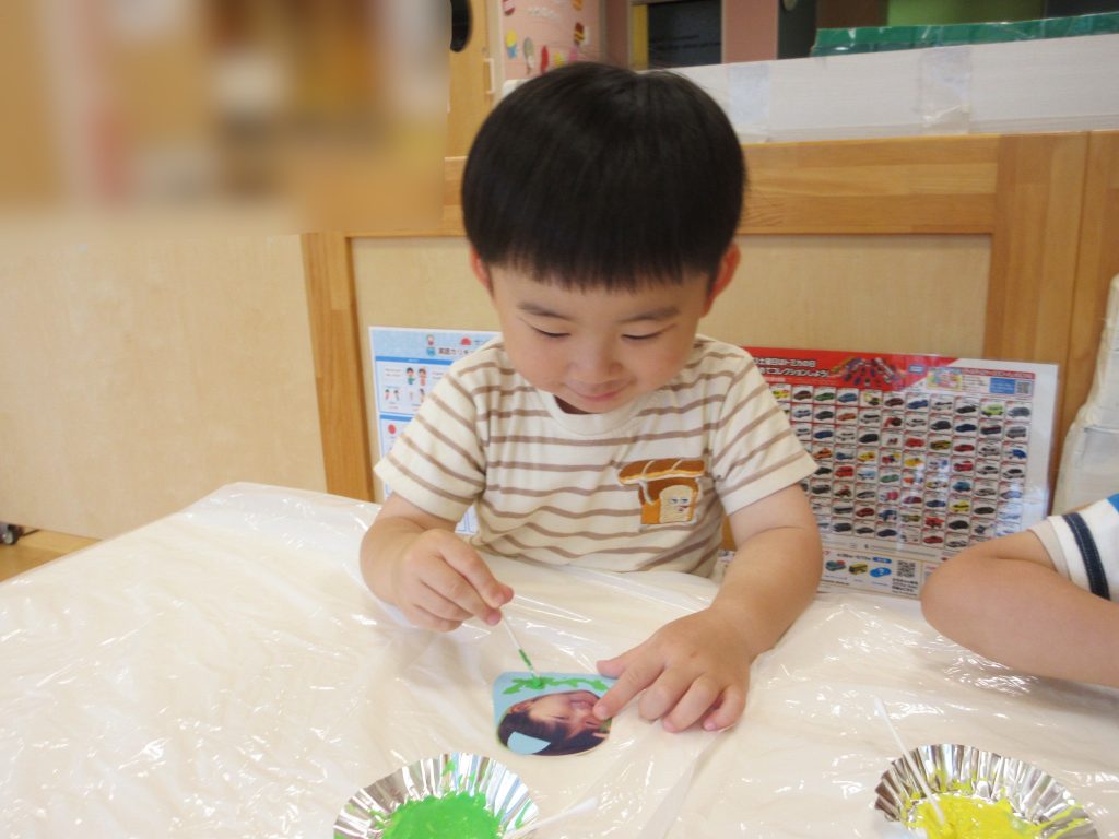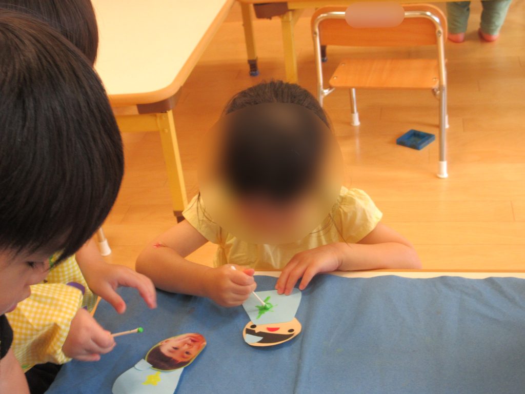 最後に、子どもたちに作ってもらった織姫様と彦星様のお洋服に、絵の具をつけた綿棒で模様をつけてもらいました![]()