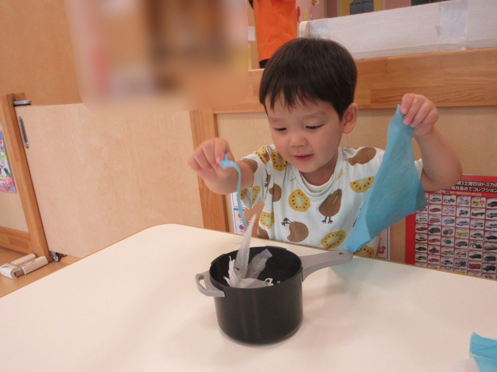 細長くちぎる子もいれば、ちぎった花紙を丸めて小さくする子もいました![]()