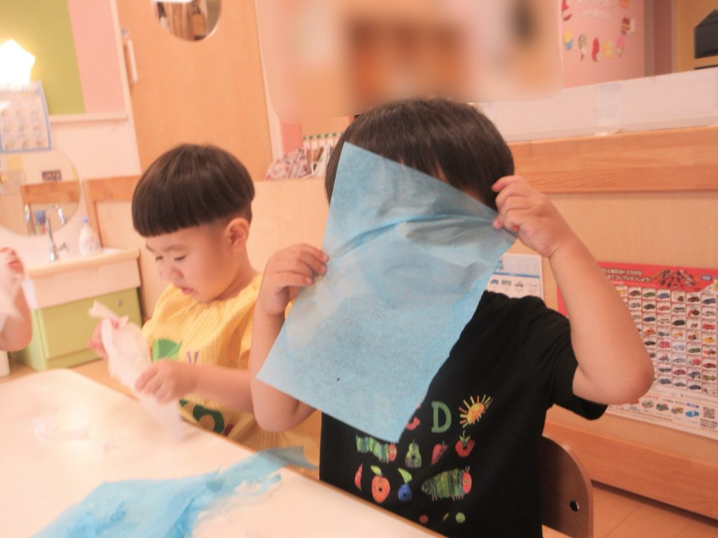「みえるかな?」「あおいろにみえる〜!」と花紙からお顔を覗かせてくれる子もいました![]()