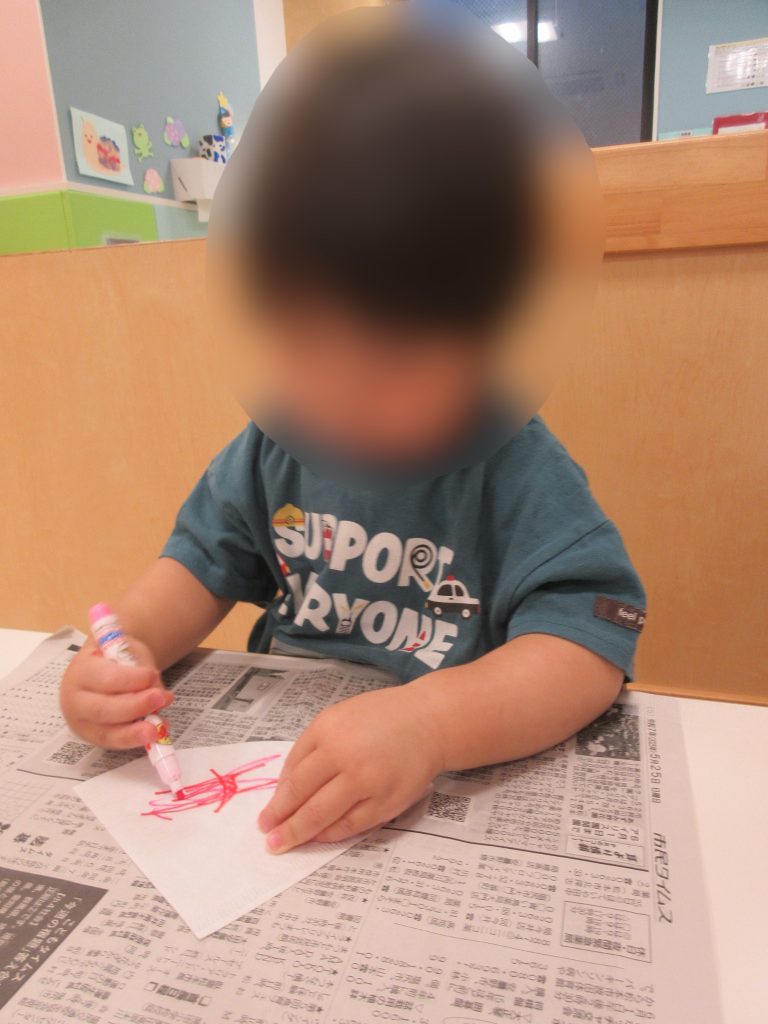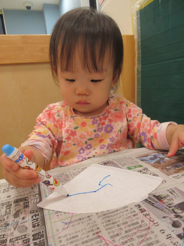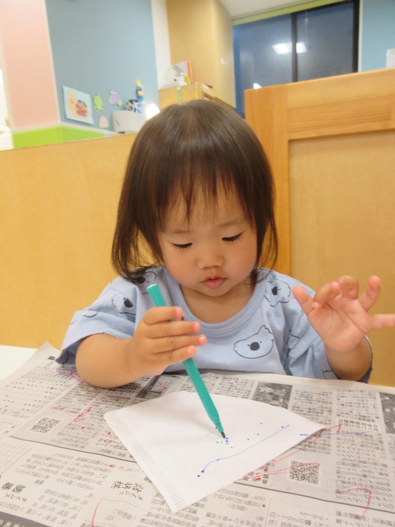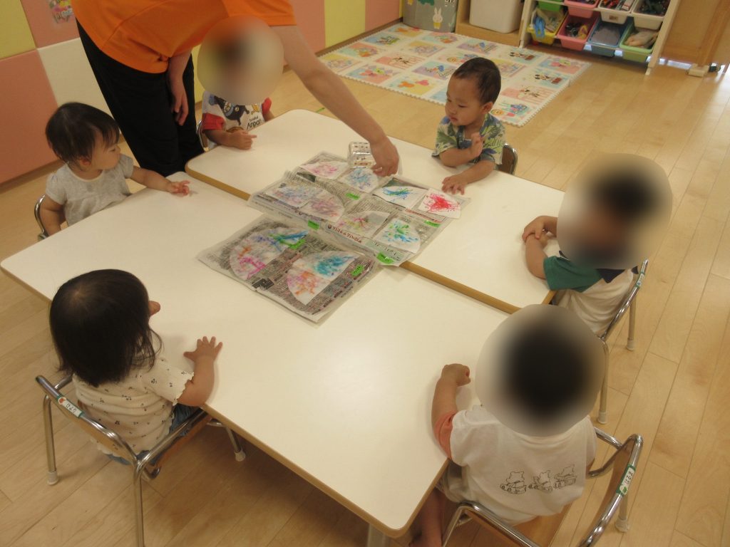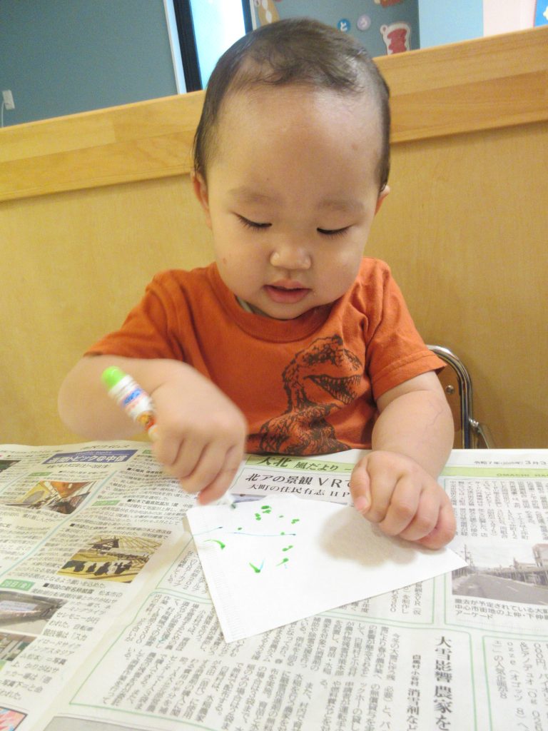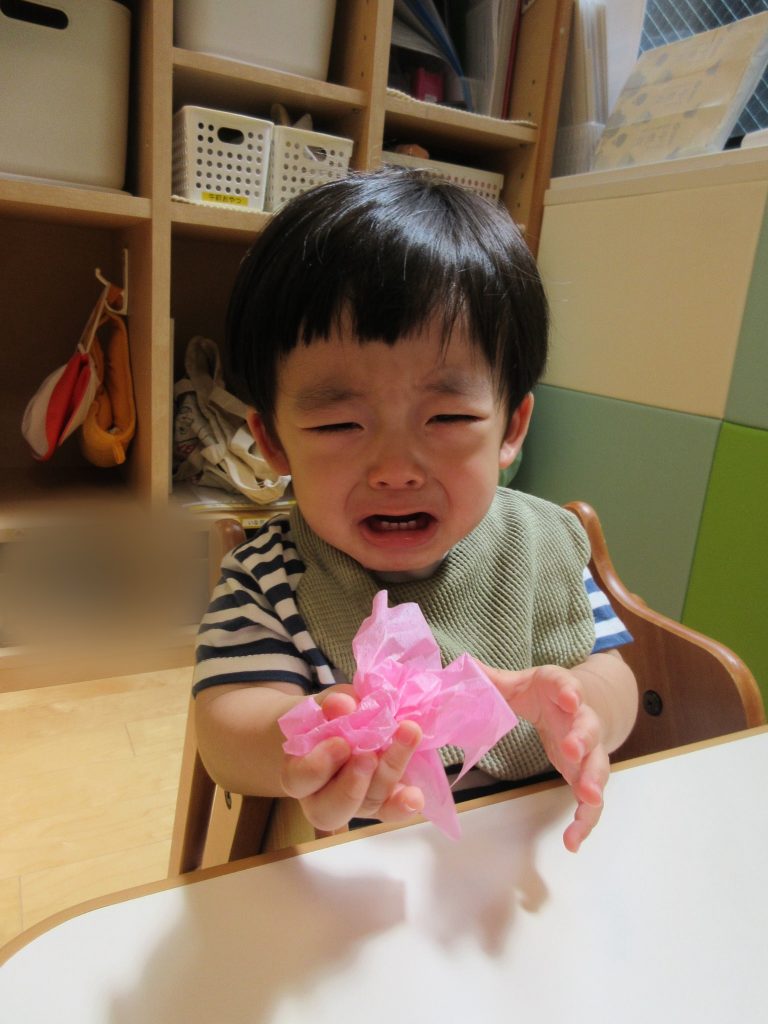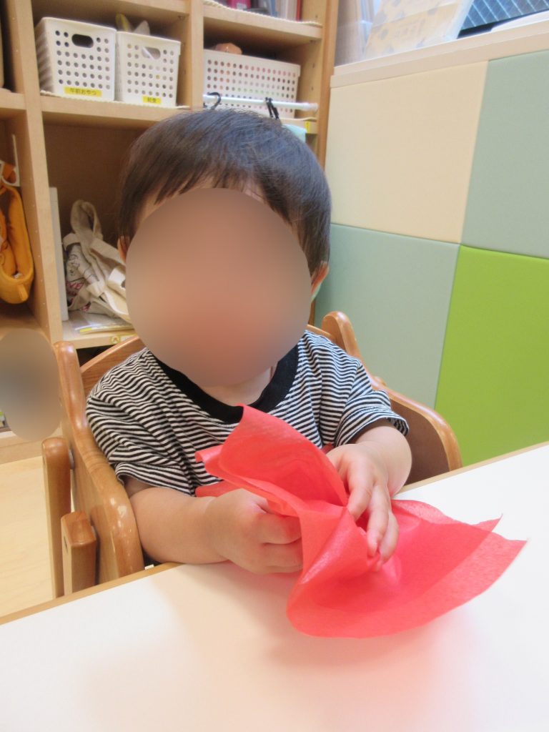 初めてのお花紙の感触に少し戸惑っているのか、先生の顔をじーっと見ていた子、