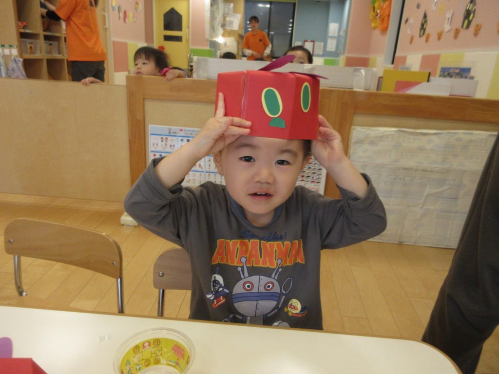 牛乳パックで作った帽子に赤い画用紙を貼り