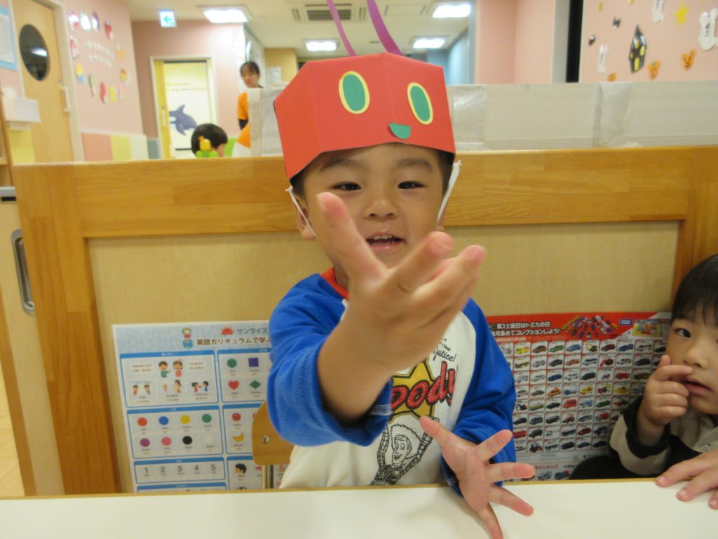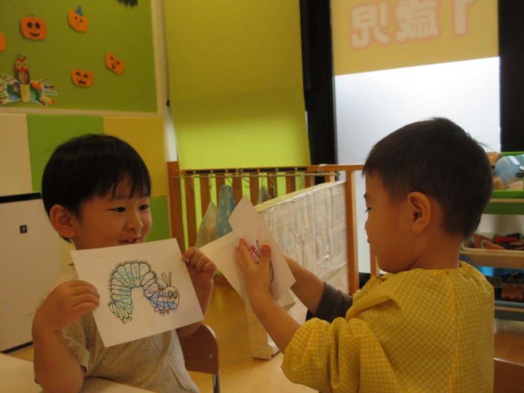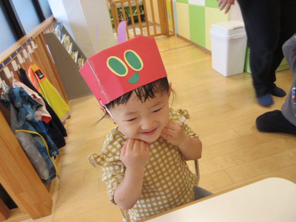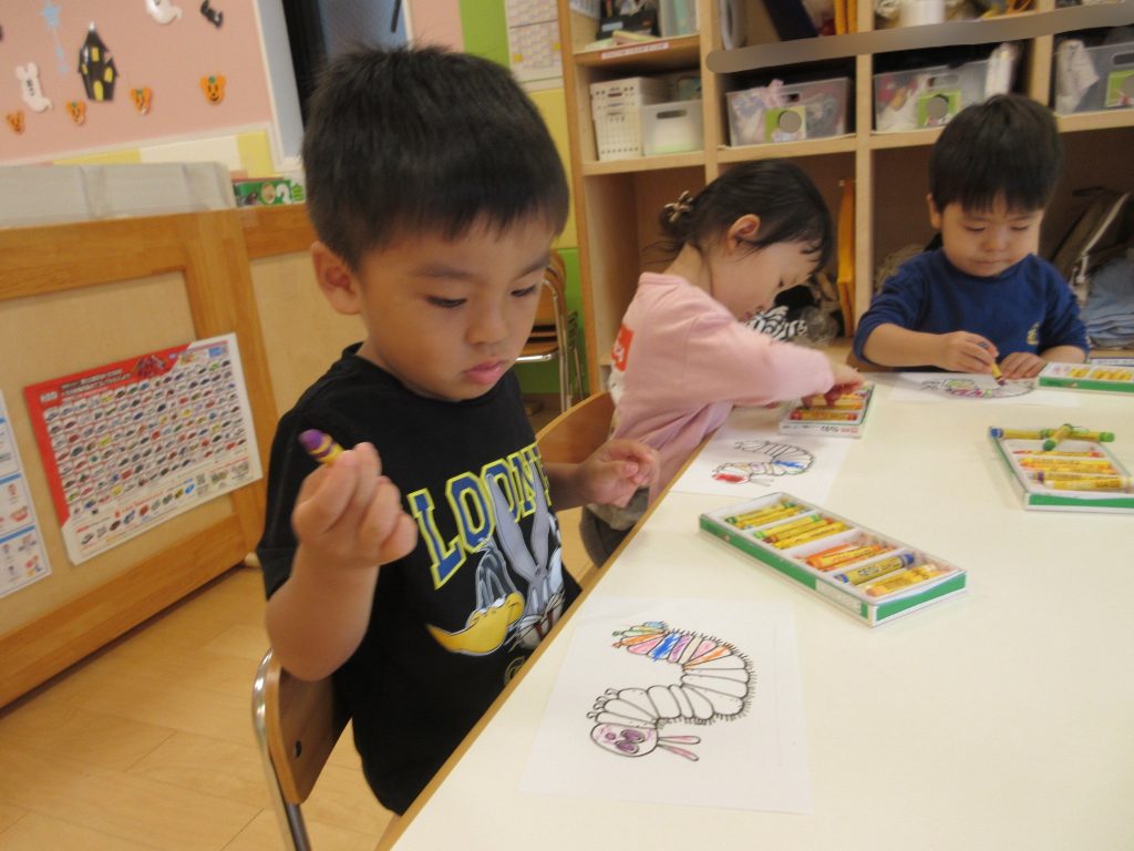 子どもたちにはあおむしの顔のパーツ(目・鼻・触角)を貼ってもらいました![]()