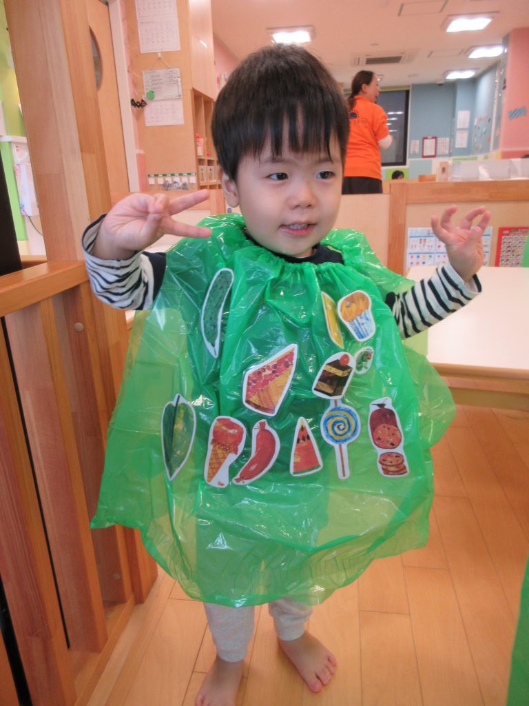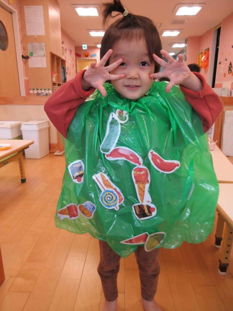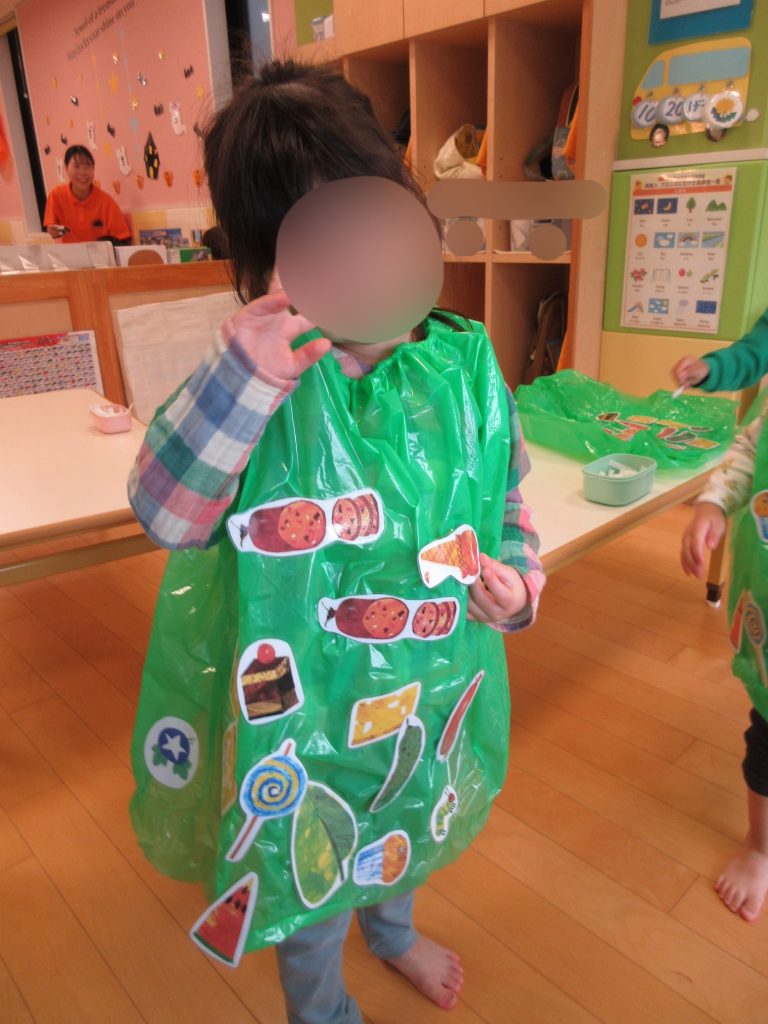 最後は、ポリ袋で作った衣装にあおむしの絵本に出てくる