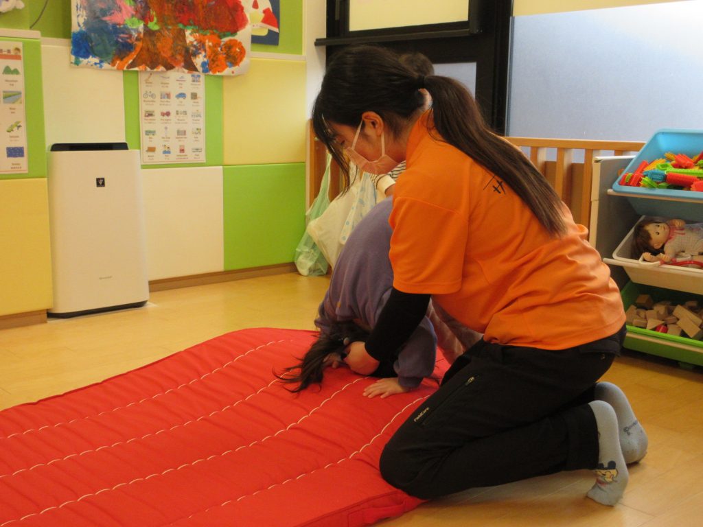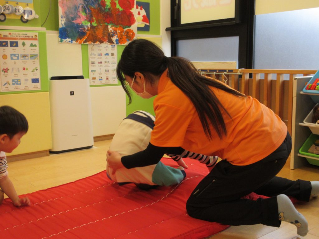 りんご組さんでは、前転の練習をしています