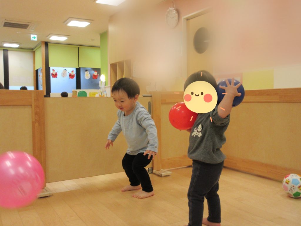 ボールを頭の上から投げてみよう!との保育者の言葉掛けにもも組さんが真似をして投げていますね!