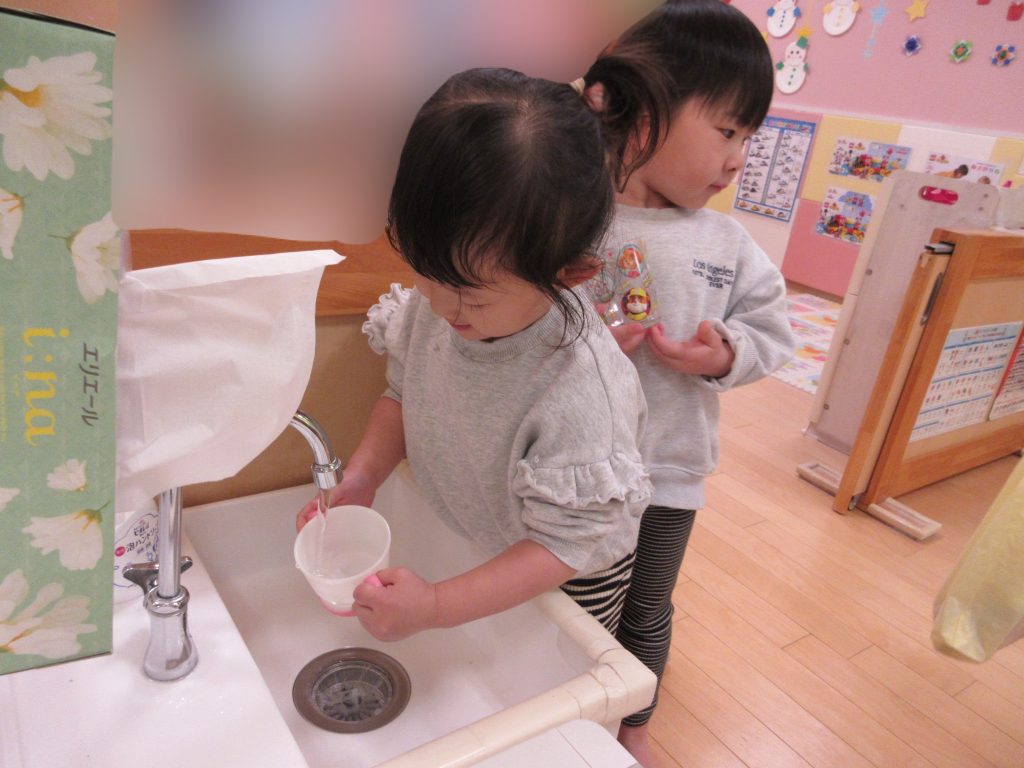 初めはうがいに苦戦していた子も上手にうがいができるようになり、「グチュグチュペッできたよ〜!」と得意げに教えてくれる姿が見られました![]()