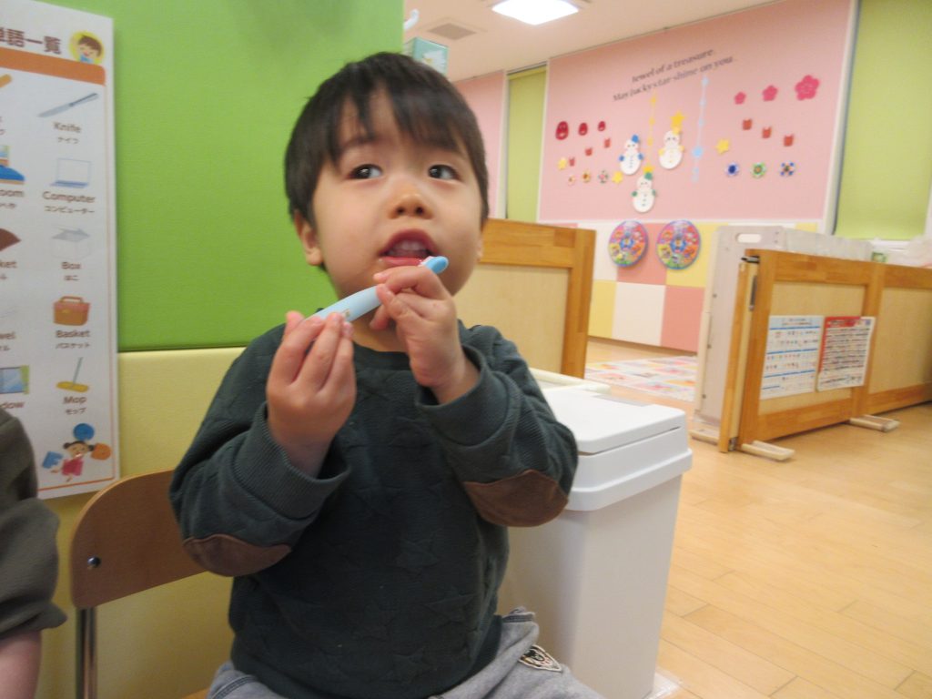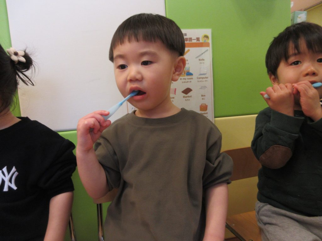 給食を食べ終わった子から歯磨きセットを持ち、椅子に座って歯磨きをしているのですが歯と歯の隙間や噛み合わせの部分まで上手に磨くことができていますよ![]()