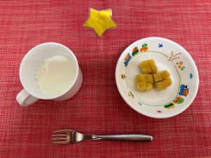 (写真は1.2歳児食です。年齢によって盛り付け量を変えて、提供しています。)