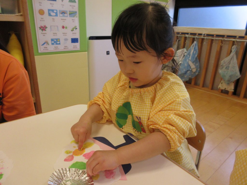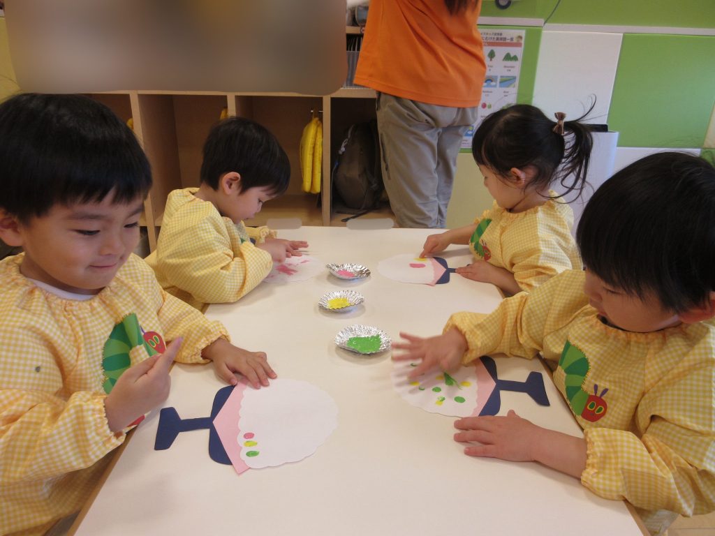 ピンク・黄緑・黄色の3色で指スタンプをしてもらうと、同じ場所にスタンプし大きなひなあられを作る子や、「まぜたら まぜたら なにいろなるかな〜?」と歌って、画用紙の上でくるくる混色を楽しむ子等、楽しそうに色をつける姿がありましたよ![]()