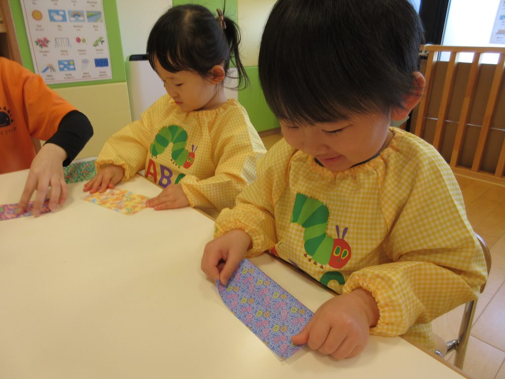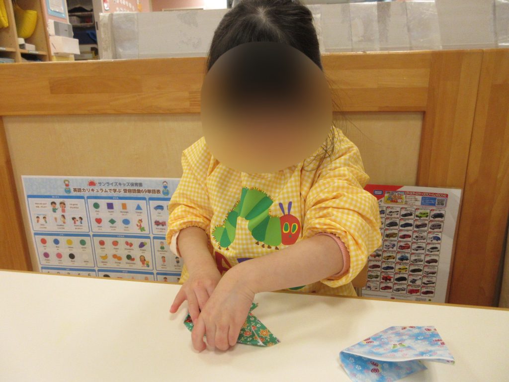お雛様、お内裏様の着物は子どもたちに好きな柄を選んでもらい、3回折りに挑戦してみたのですが、保育士の手本を見ながら一生懸命折る姿が見られました![]()